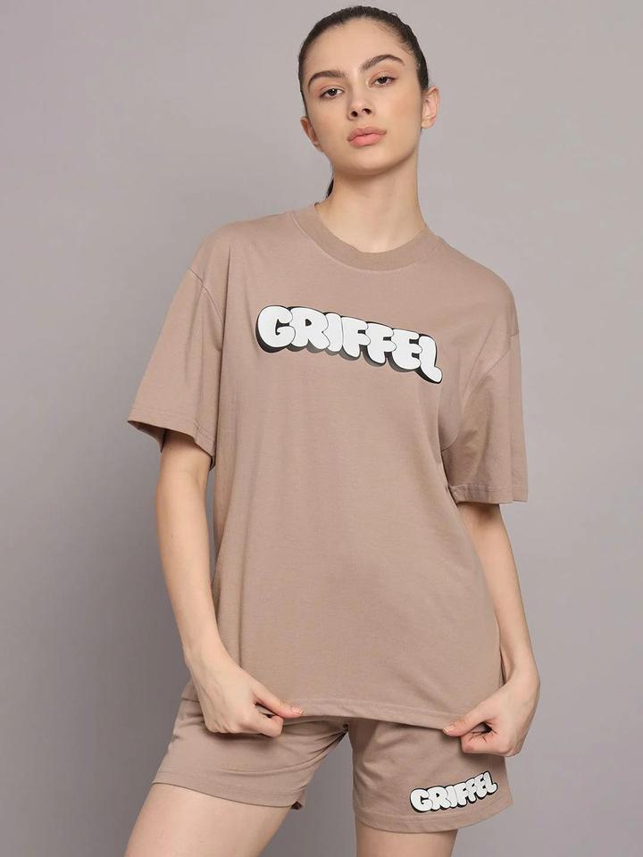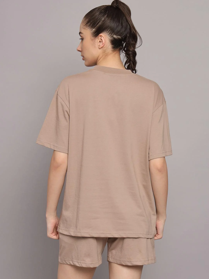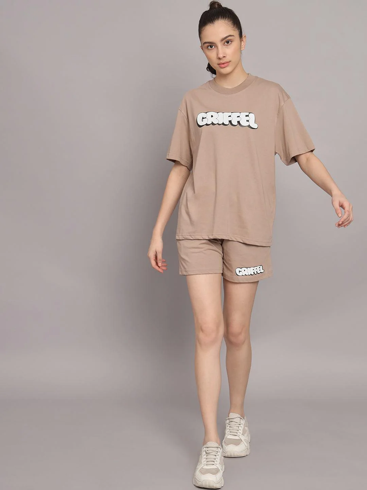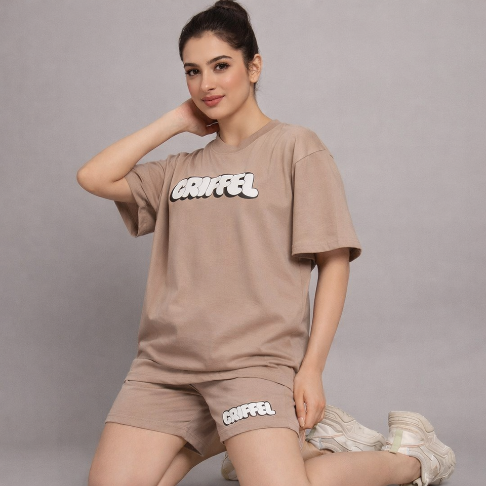 เสื้อยืดโอเวอร์ไซส์ผู้หญิงพร้อมกางเกงขาสั้น ชุดลำลองสไตล์สตรีท ผ้าฝ้ายระบายอากาศ รับผลิตตามสั่งพร้อมสกรีนโลโก้