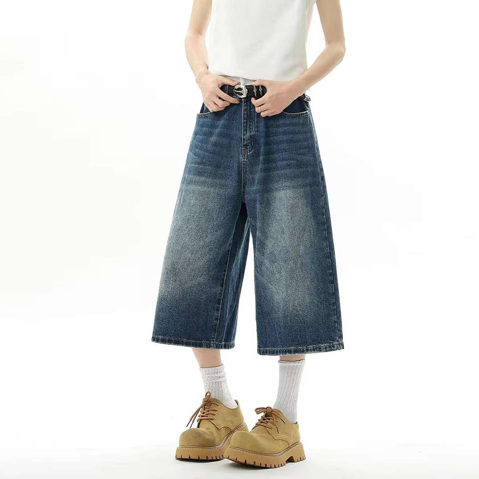 กางเกงยีนส์ขาสั้นแบบมีซิปสำหรับผู้ชายกางเกงขาสั้นผ้ายีนส์ลายลิงสกปรกซักได้ตามต้องการ