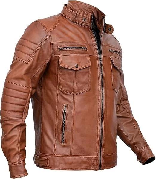 แจ็คเก็ตหนังแท้สีน้ำตาลสำหรับผู้ชาย แบบสั่งทำขายส่ง แจ็คเก็ตสไตล์ไบค์เกอร์ แจ็คเก็ตคาเฟ่เรเซอร์ หนังแกะ ทรงเข้ารูป