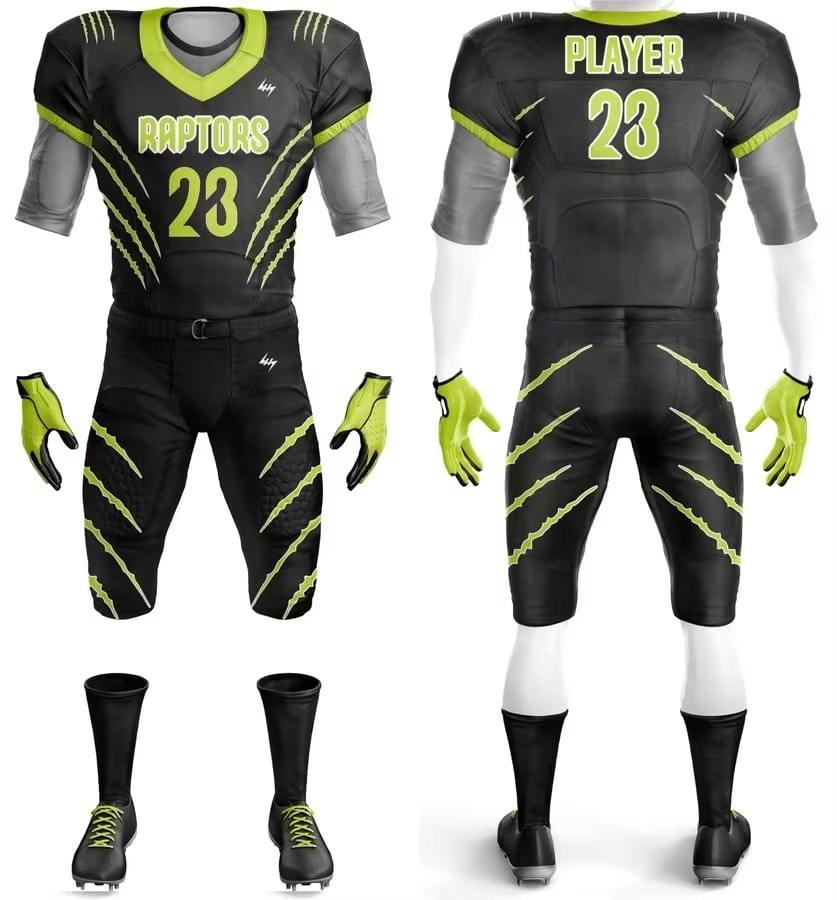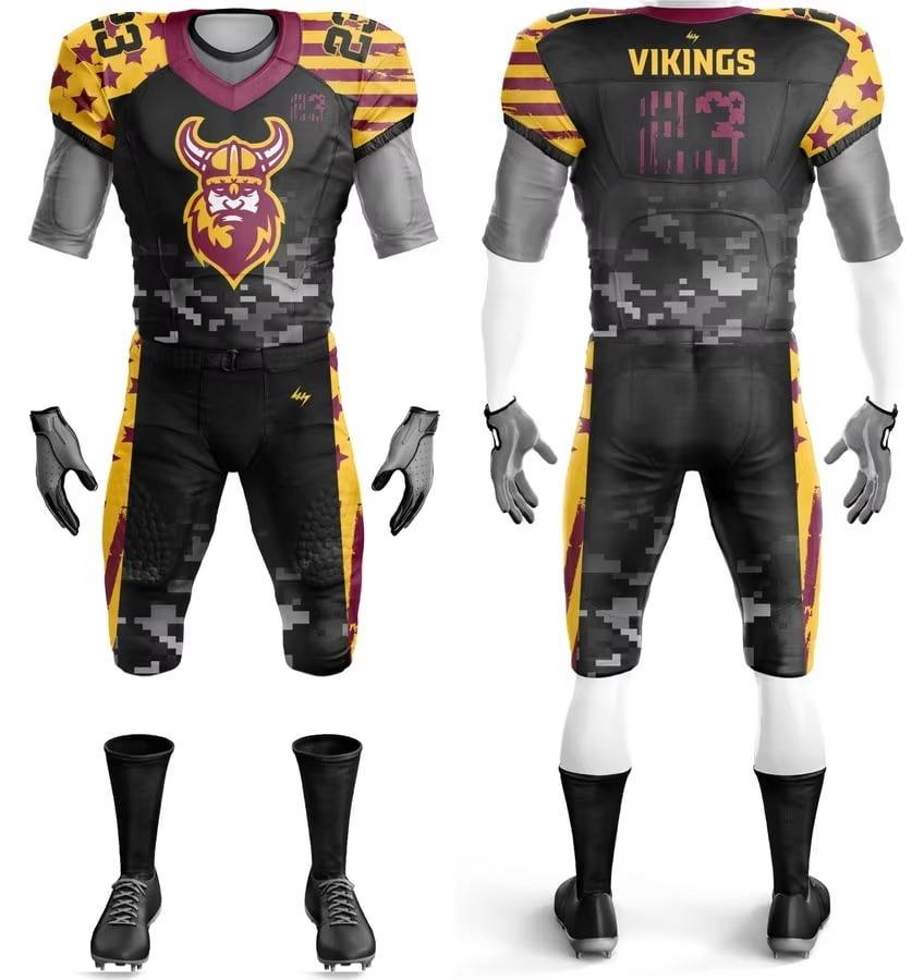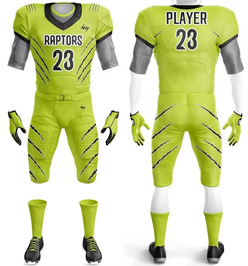 ชุดเสื้อและกางเกงอเมริกันฟุตบอลสั่งทำขายส่ง พิมพ์ลายแบบซับลิเมชั่น ระบายอากาศได้ดี ชื่อทีม แขนสั้น โพลีเอสเตอร์ 100%