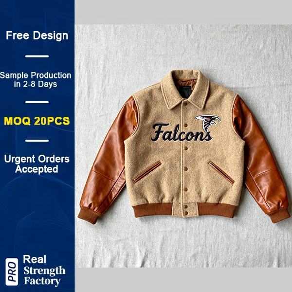 รับผลิตเสื้อแจ็คเก็ต Letterman ปักลายตามสั่ง เสื้อแจ็คเก็ตหนัง Varsity แบบกำหนดเอง เสื้อแจ็คเก็ตหนังสำหรับผู้ชาย