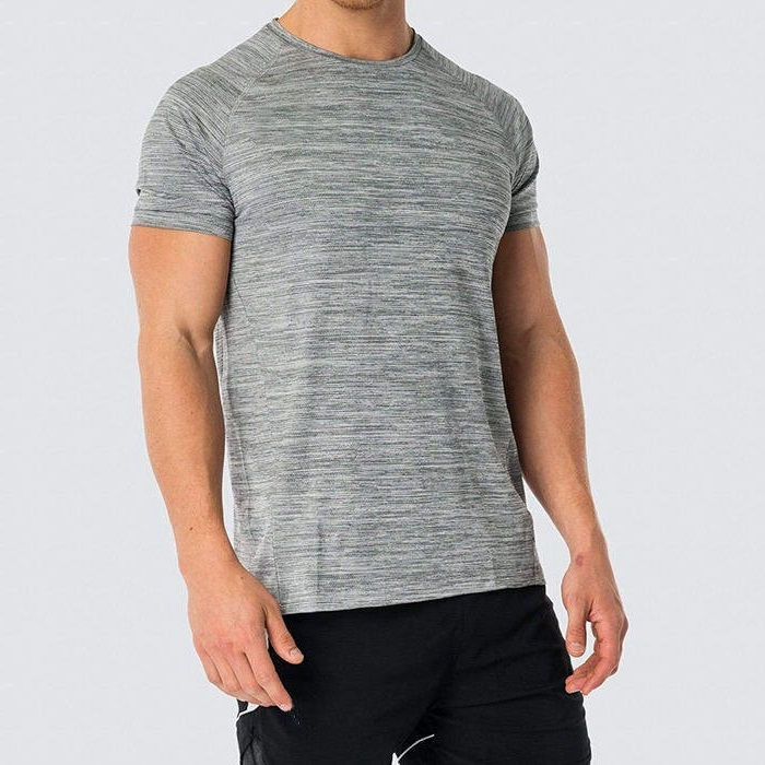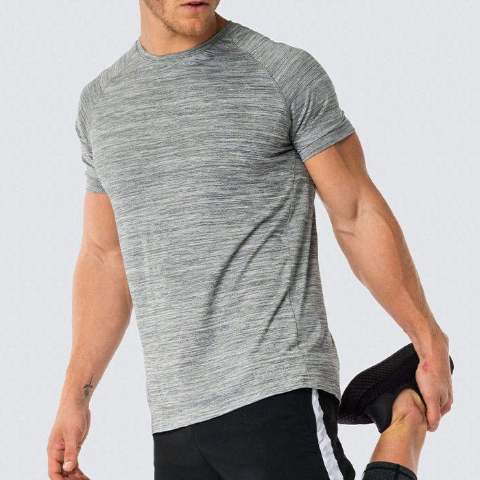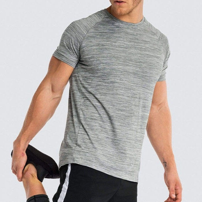 เสื้อยืดออกกำลังกายผู้ชายแบบสลิมฟิตถักนิตติ้งสำหรับวิ่งและฝึกซ้อมในยิม แห้งเร็ว ระบายอากาศได้ดี รับผลิตตามสั่งขายส่ง