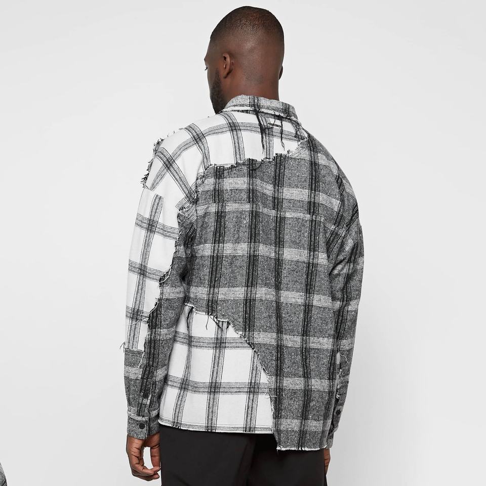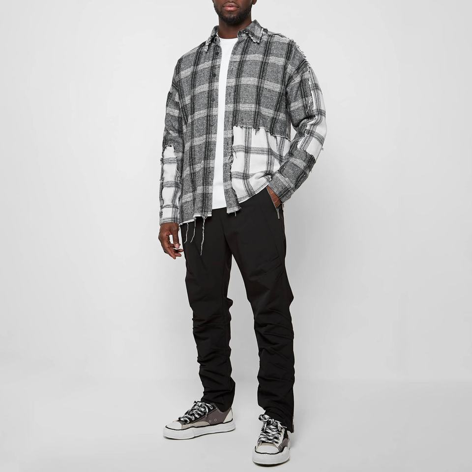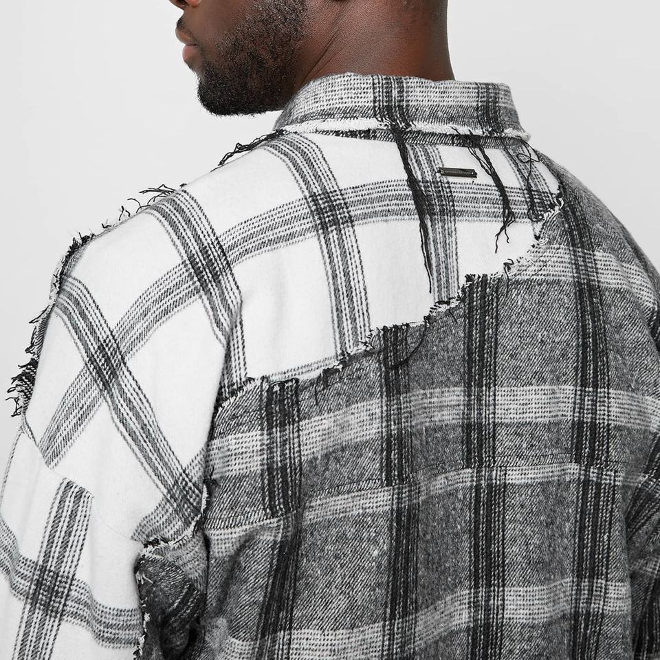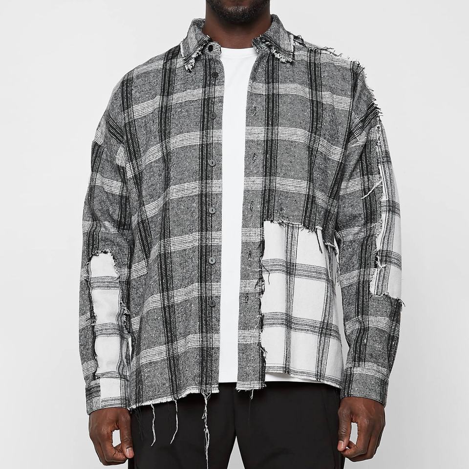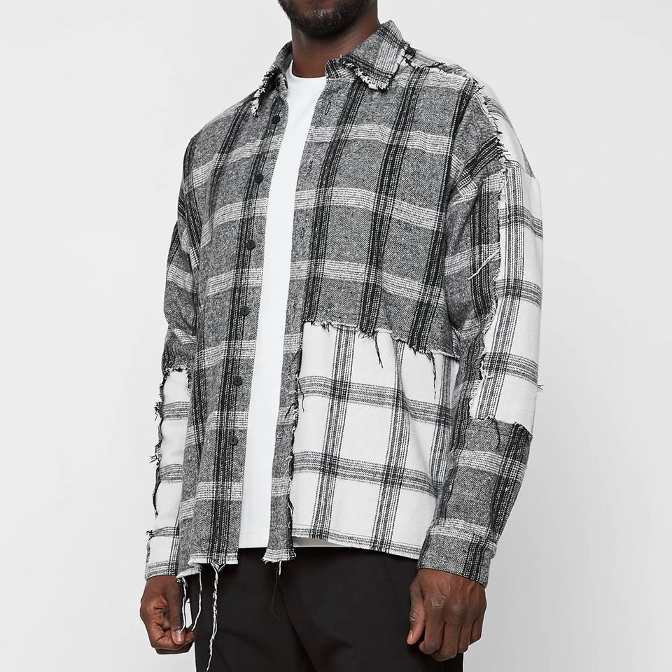 เสื้อเชิ้ตผ้าแฟลนเนลผู้ชายสั่งทำขายส่ง ลายตารางสีเทาผสมสี แบบดิสเทรส