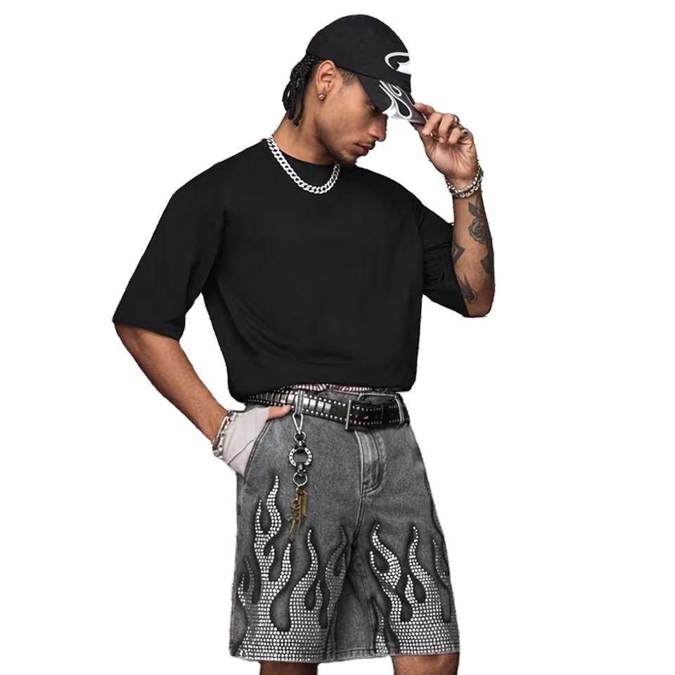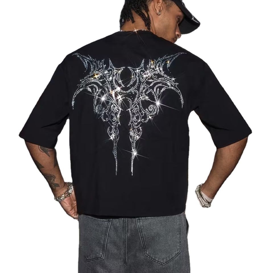 เสื้อยืดคอตตอนถักน้ำหนักมากสำหรับผู้ชาย สไตล์วินเทจ ล้างสีแบบแอซิด ป้องกันรอยยับ ประดับด้วยพลอยและคริสตัล ทรงปกติ รับผลิตตามสั่งขายส่ง