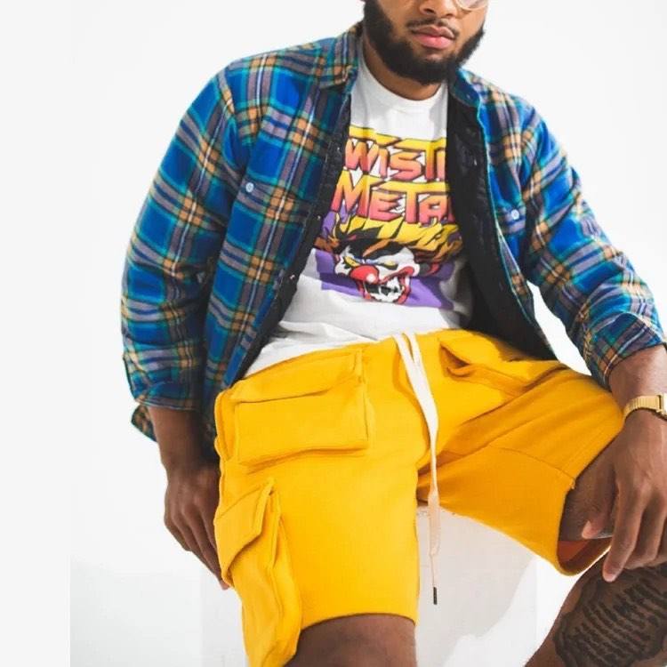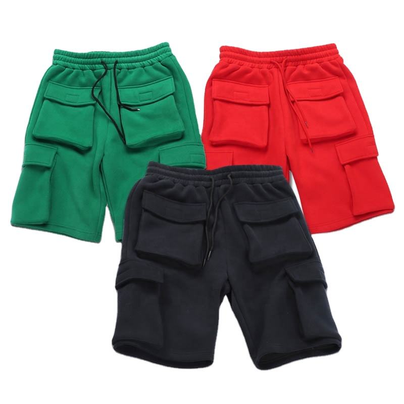 กางเกงขาสั้นผ้าคอตตอนเอวกลางของผู้ชายกางเกงขาสั้นผ้าคอตตอนหลายกระเป๋าลายทึบย้อมสไตล์ลำลองสำหรับ100% งานตามสั่ง