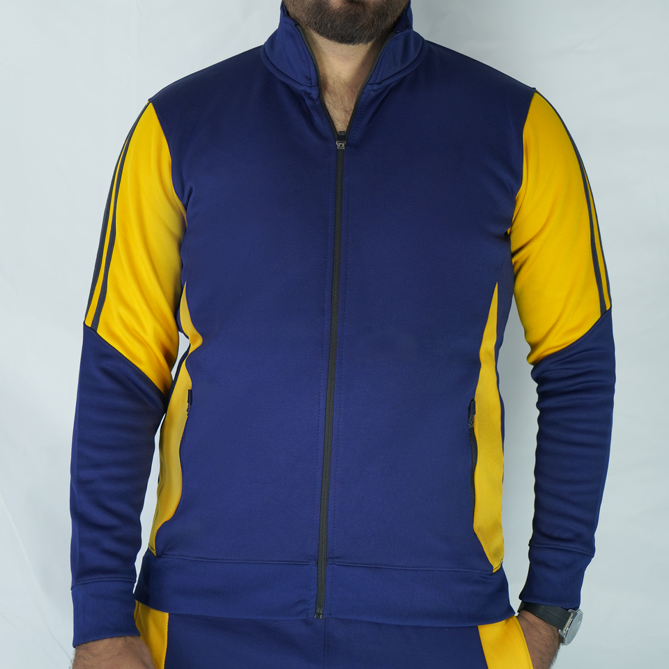 เสื้อแจ็กเก็ตซิปเต็มตัวสำหรับผู้ชายเสื้อกีฬาผ้าโพลีเอสเตอร์ระบายอากาศสีเหลืองตัดสีฟ้า