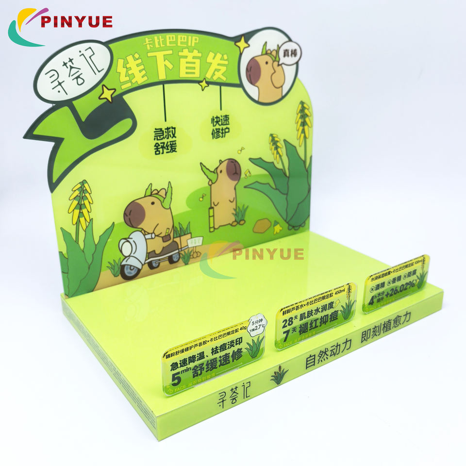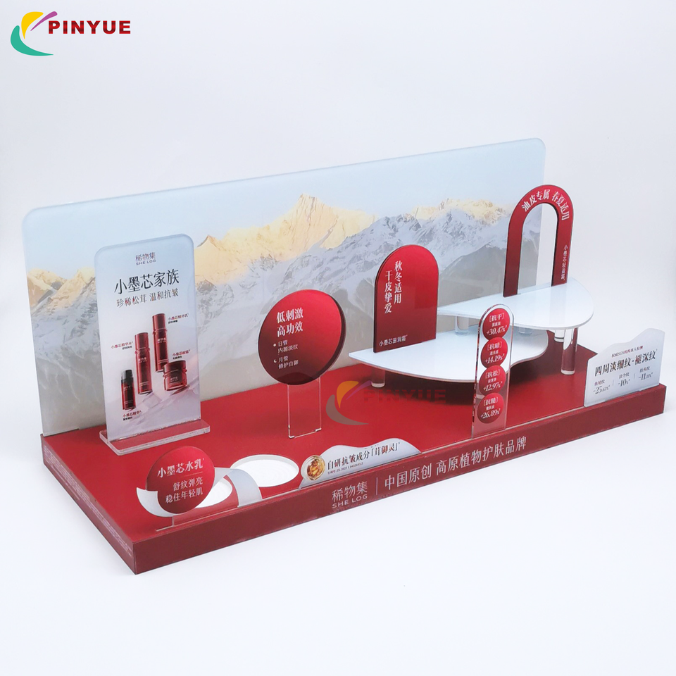 ขาตั้งโชว์สินค้าเครื่องสำอางและผลิตภัณฑ์บำรุงผิวแบบตั้งโต๊ะ ดีไซน์ทันสมัย รับผลิตตามสั่ง พร้อมไฟ LED และโลโก้ 3 มิติ บนอะคริลิค