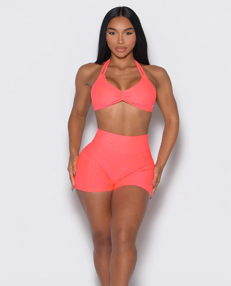 ชุดออกกำลังกายขาสั้นเอวสูงสำหรับผู้หญิงชุดออกกำลังกายเล่นฟิตเนส2ชิ้นสีชมพูนีออนออกแบบได้ตามต้องการ