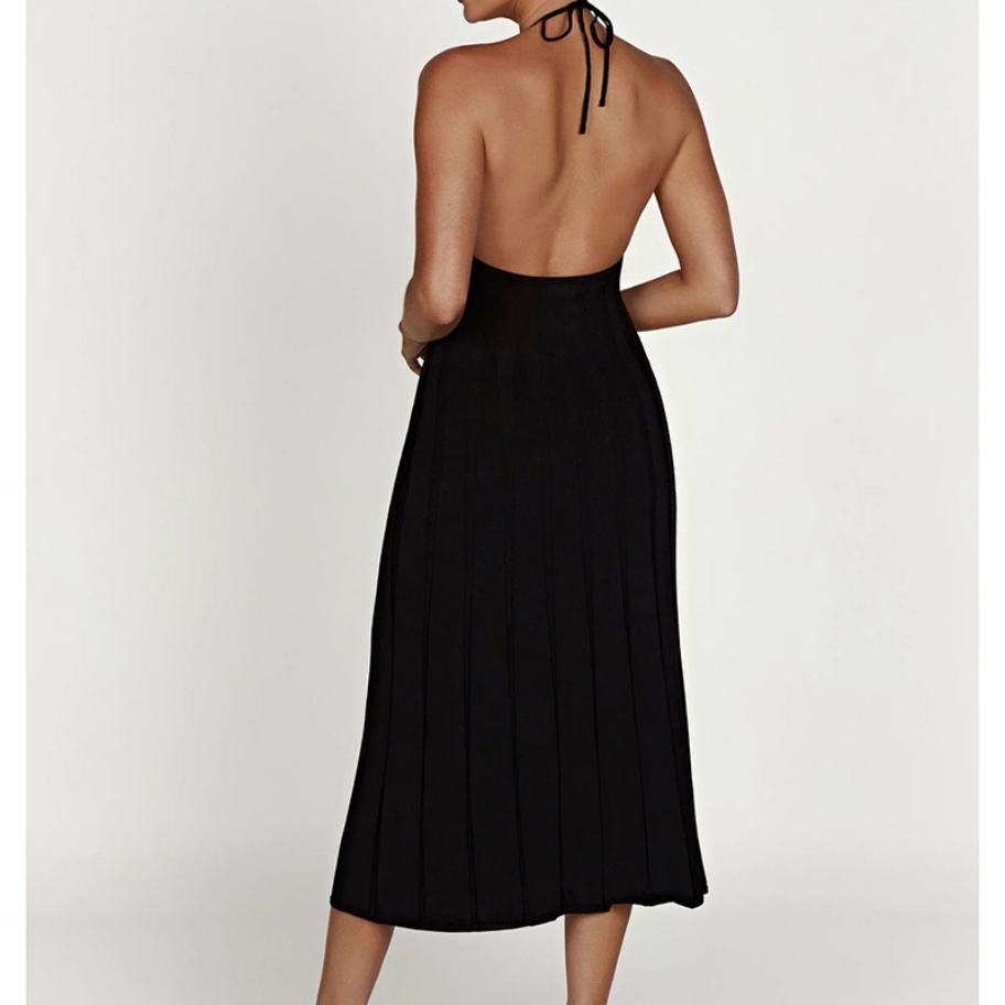 เดรสไหมพรมผู้หญิงสไตล์ลำลองคุณภาพสูงแบบขายส่ง OEM สำหรับฤดูใบไม้ร่วง ดีไซน์ใหม่สีดำ เซ็กซี่ แฟชั่น คอวี โชว์หลัง ความยาวปานกลาง