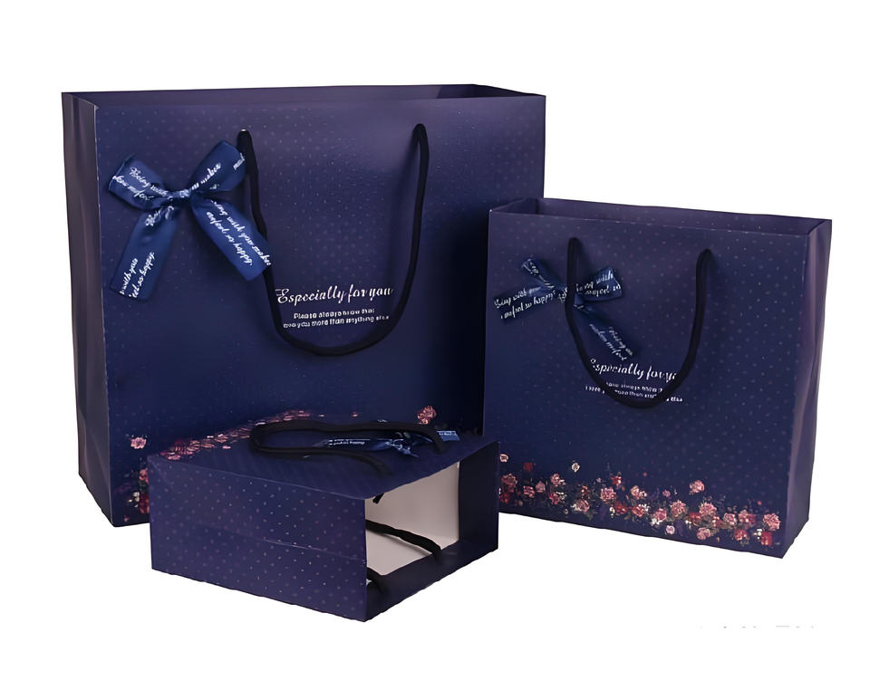 ถุงกระดาษมีหูจับสำหรับใส่เครื่องประดับเสื้อผ้าหรูหราพิมพ์ลายโลโก้แบรนด์ตามสั่ง
