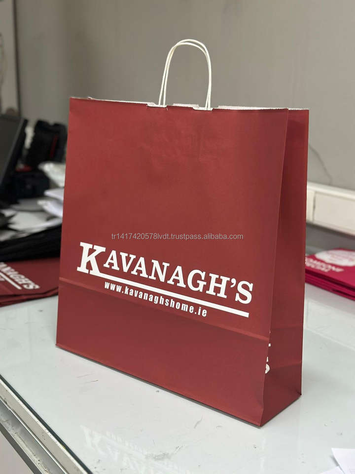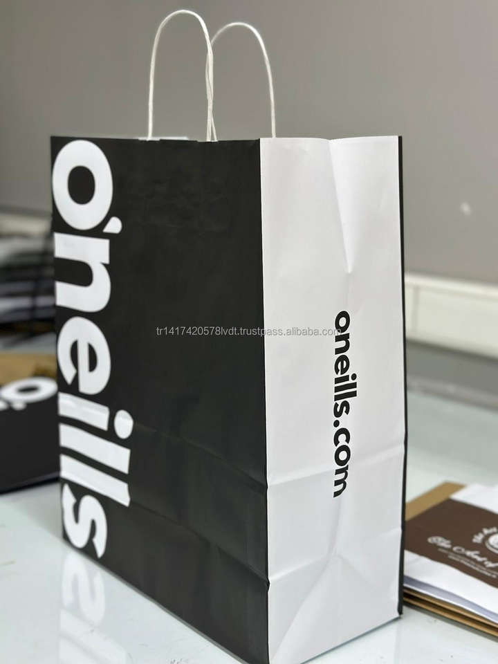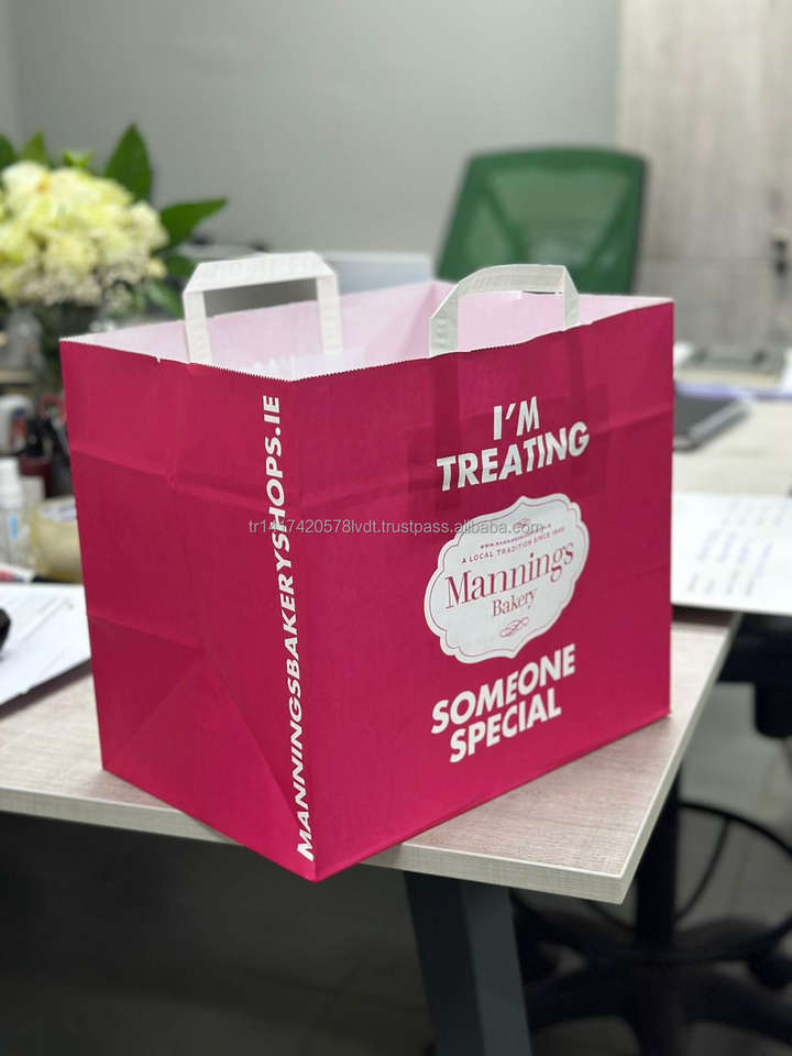ถุงกระดาษคราฟท์พิมพ์ลายที่มีด้ามจับแบนและบิดสำหรับเค้กอาหารของขวัญและร้านขายของชำโลโก้ที่กำหนดเอง