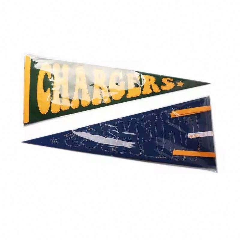 ธงสามเหลี่ยมผ้าสักหลาดราคาถูก พิมพ์โลโก้ตามสั่ง สำหรับตกแต่งภายนอก งานกีฬา และวิทยาลัย ขายส่ง