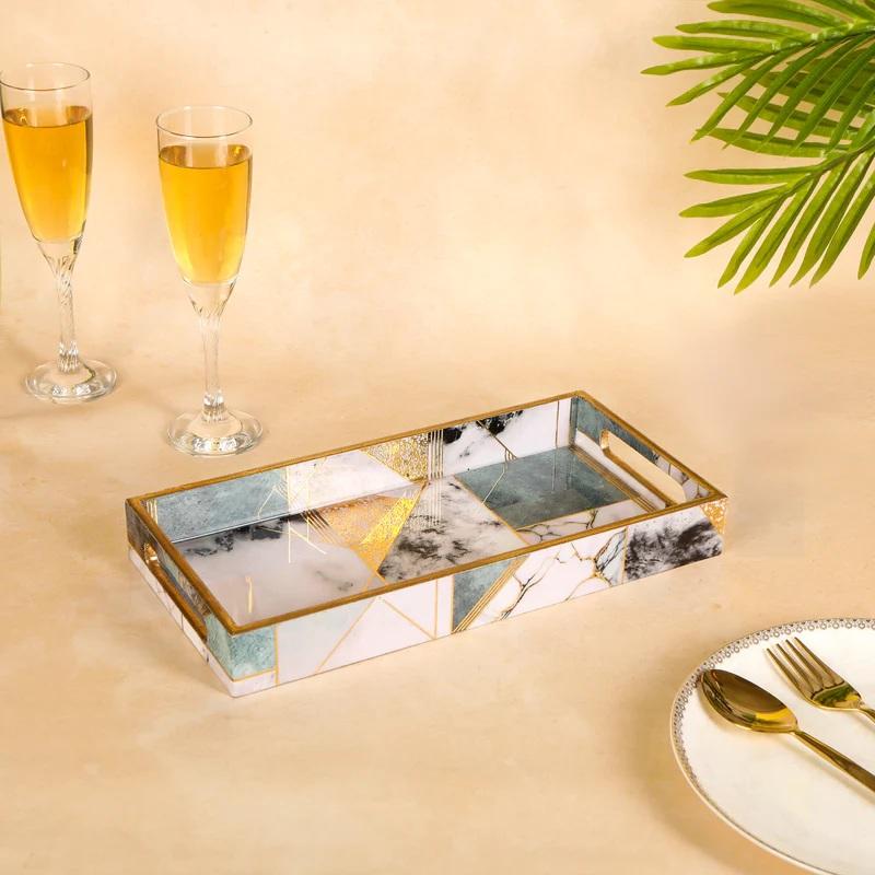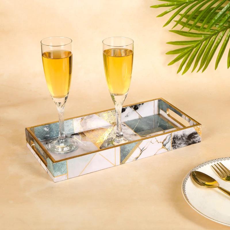 ชุดถาดเสิร์ฟหรูหราสำหรับรอมฎอนแบบขายส่ง - ขนาดยาวพร้อมกรอบสีทองและพิมพ์ลาย UV บนกระจก สำหรับใช้ในครอบครัวและร้านอาหาร