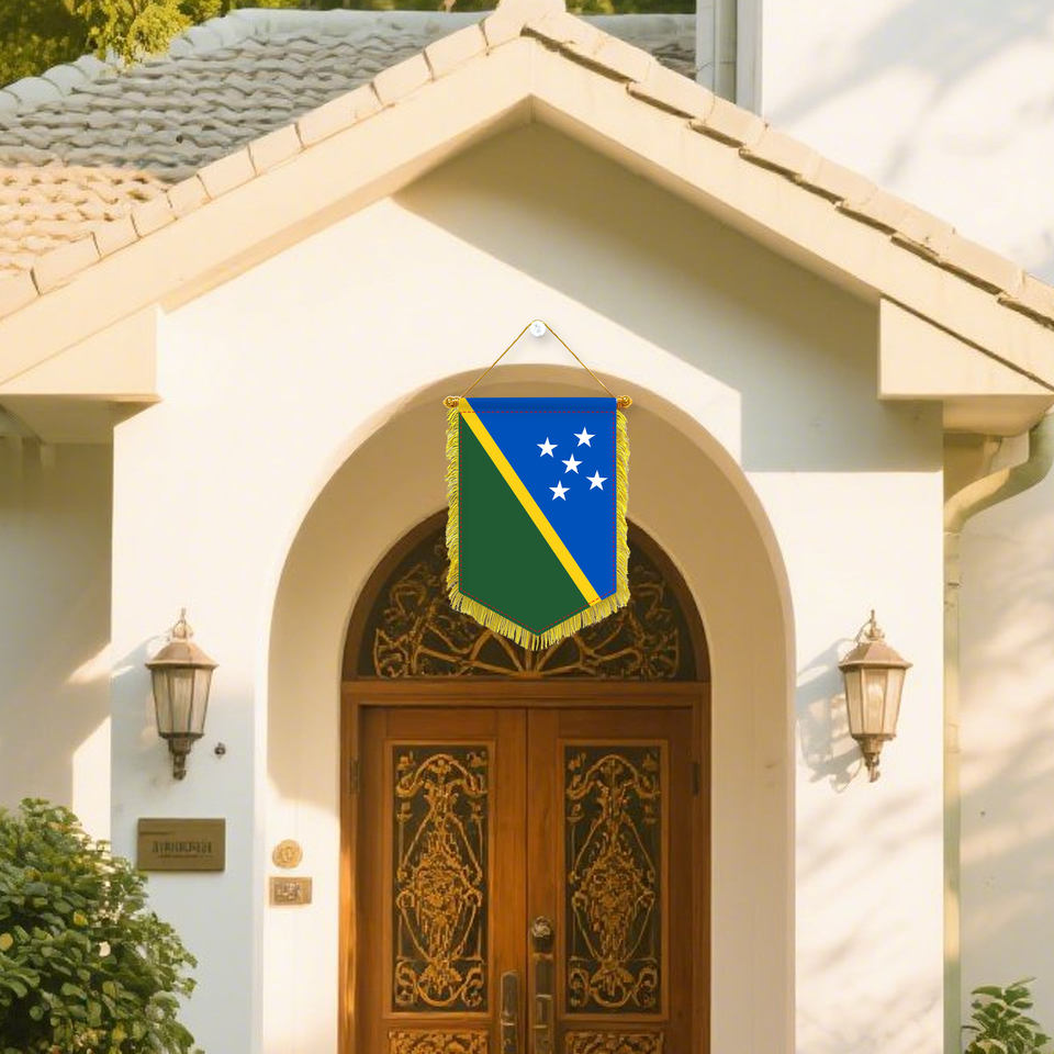 ธงโบรเคดแบบมีชายครุยของหมู่เกาะโซโลมอนสั่งทำขายส่ง ขนาด 11.81x7.87 นิ้ว สีสันสดใส ทนทาน เหมาะสำหรับตกแต่งสำนักงานและใช้เป็นของประดับ