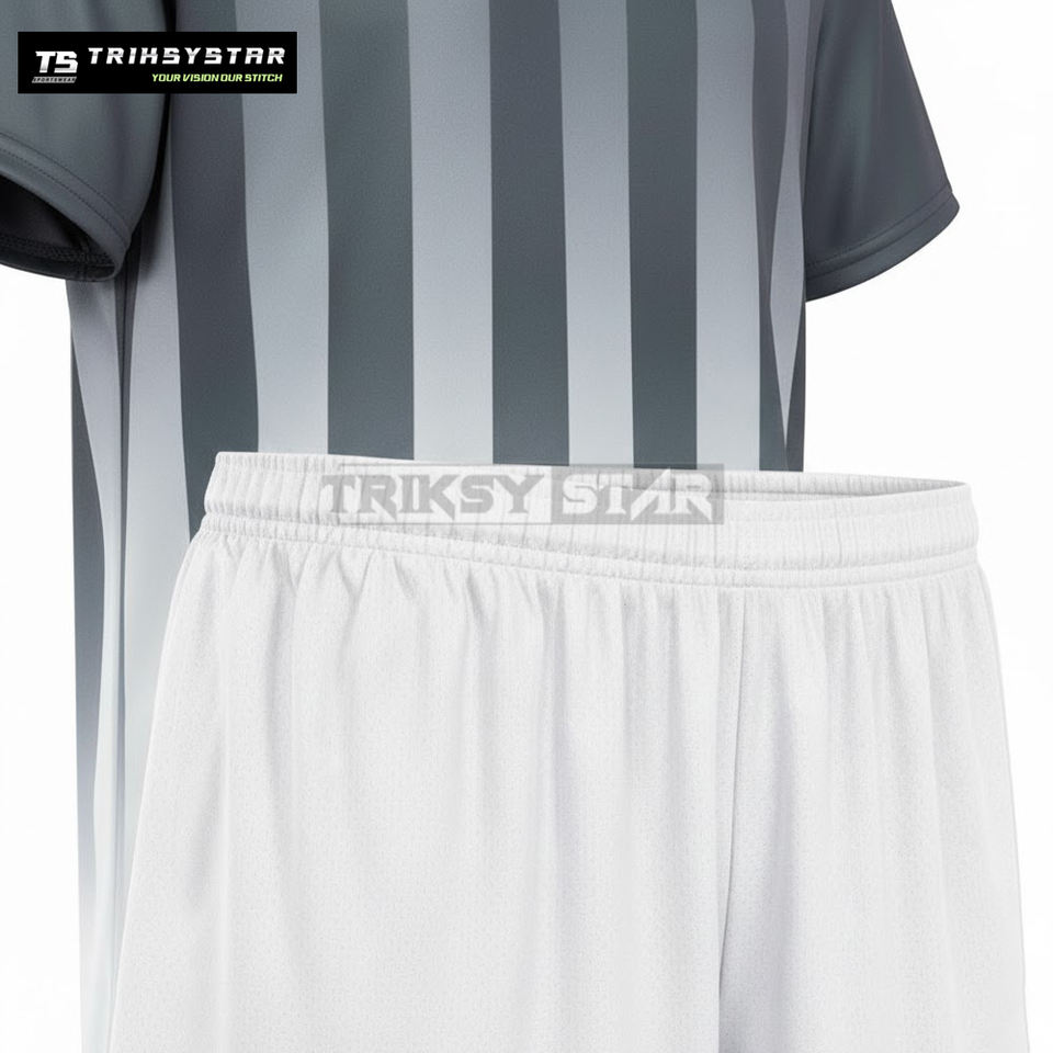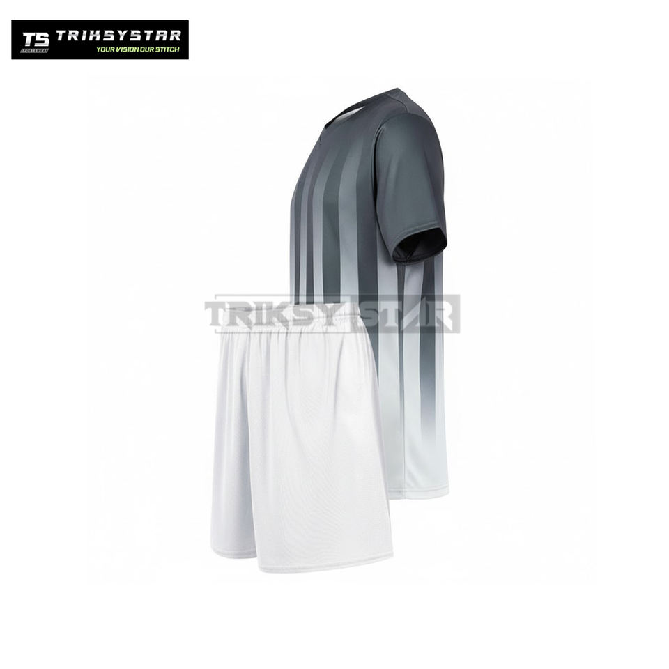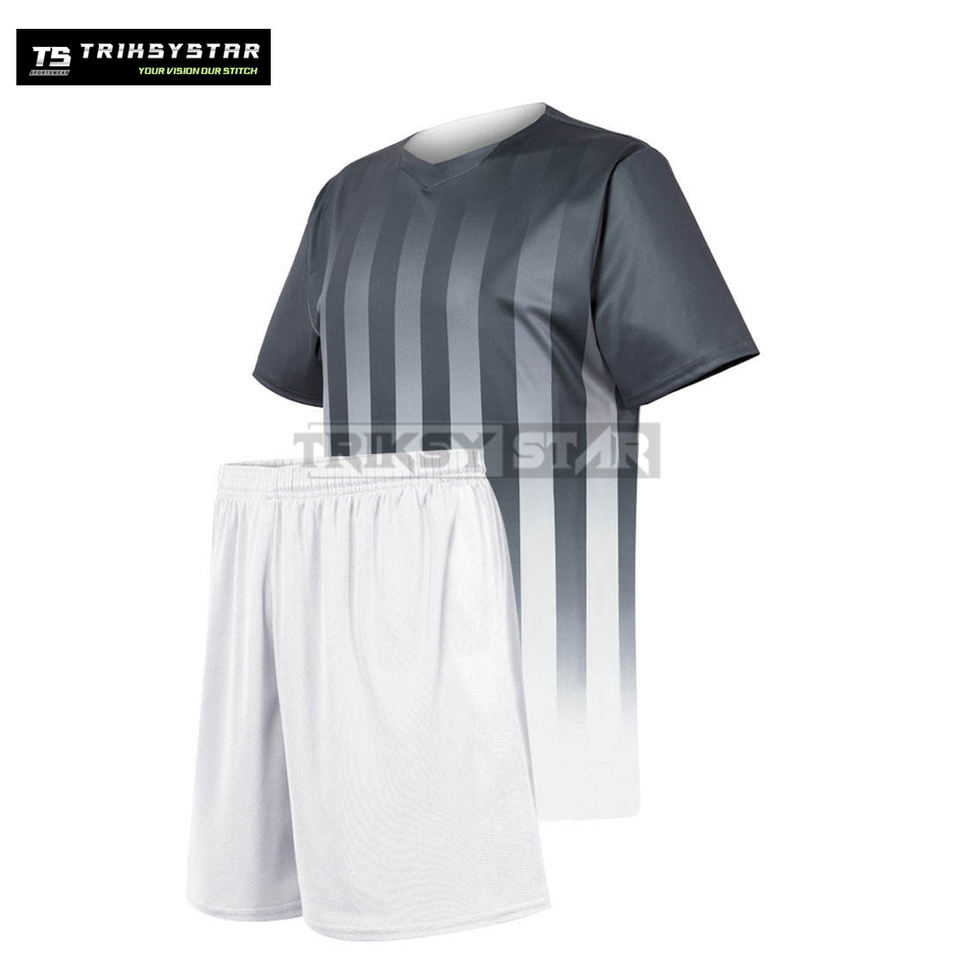ชุดฟุตบอลแบบซับลิเมชั่นสั่งทำขายส่ง ชุดทีมลายทาง เสื้อกีฬาแห้งเร็วสำหรับฤดูร้อน พร้อมกางเกงขาสั้น