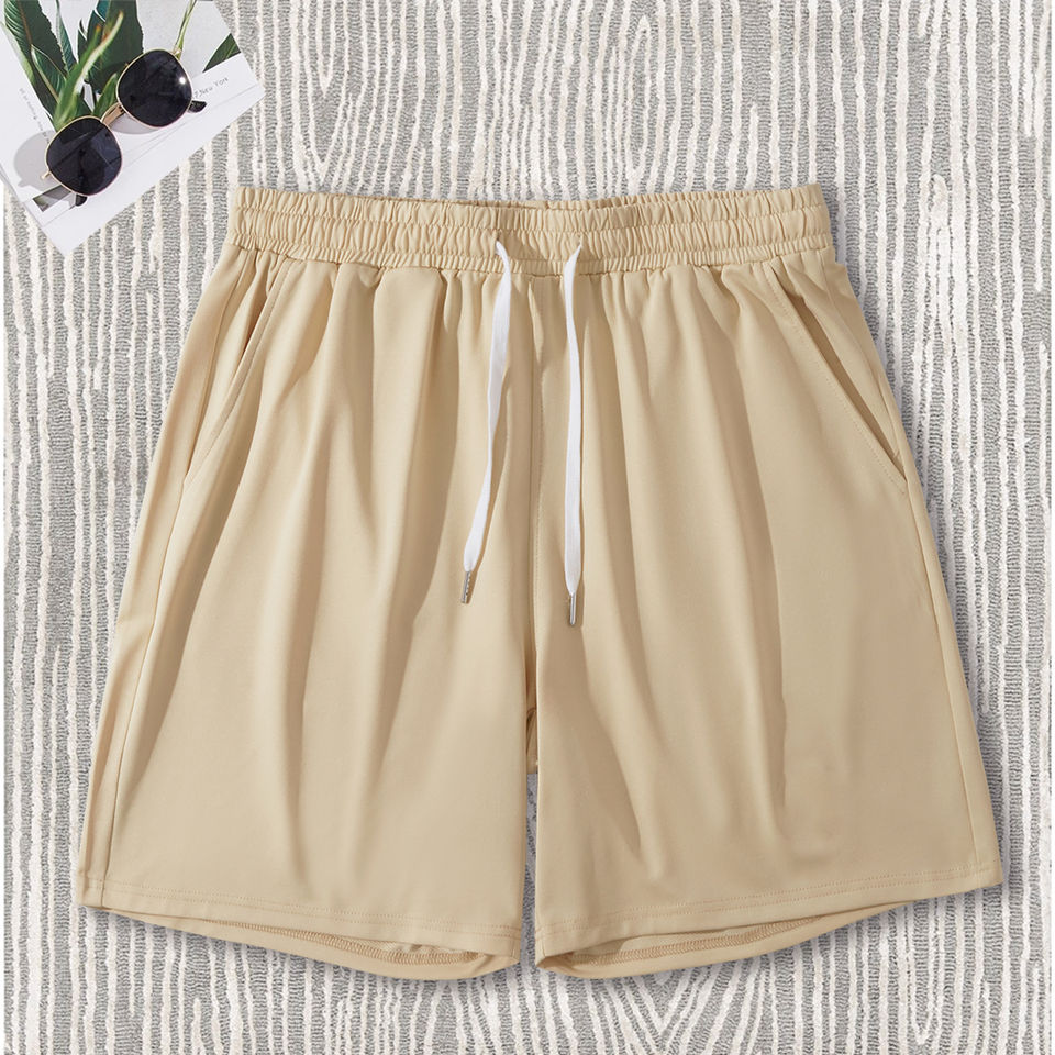กางเกงขาสั้นกีฬาผู้ชายแบบลำลองสำหรับฤดูร้อน ขายส่ง แบบกำหนดเอง แห้งเร็ว ผ้าเรียบ ระบายอากาศได้ดี เอวกลาง มีเชือกผูก