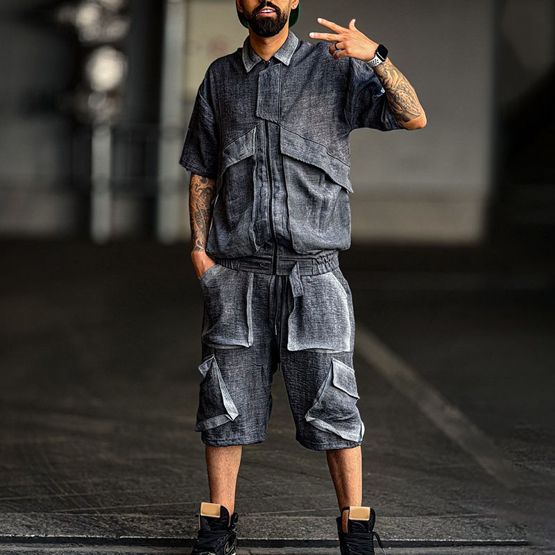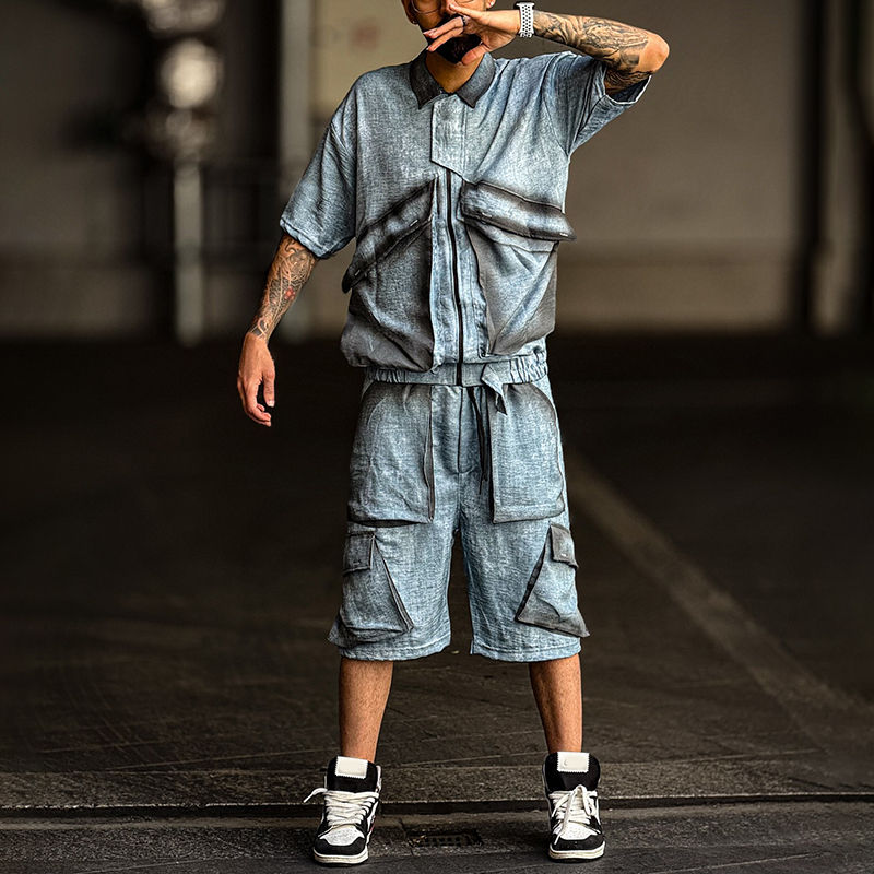 ชุดเซ็ตเสื้อยืดและกางเกงขาสั้นผ้ากำมะหยี่แบบสบายๆ ระบายอากาศได้ดี สไตล์วินเทจ ล้างสีแบบแอซิดวอช สำหรับผู้ชาย ขายส่งและรับผลิตตามสั่ง