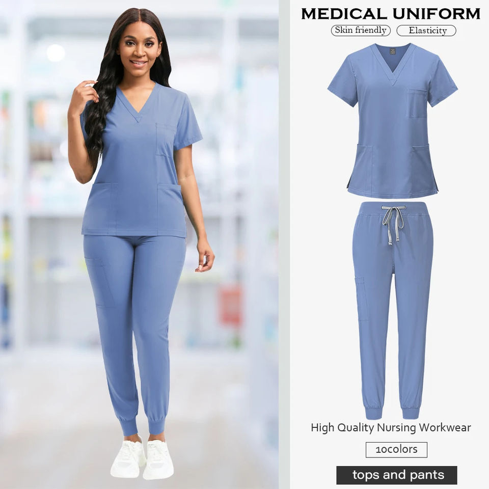 ชุดพยาบาลคอวีชุดสครับพยาบาลแขนสั้นสำหรับสตรีชุดกางเกงวิ่งขายาว