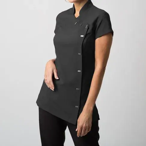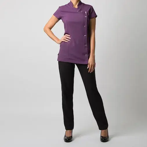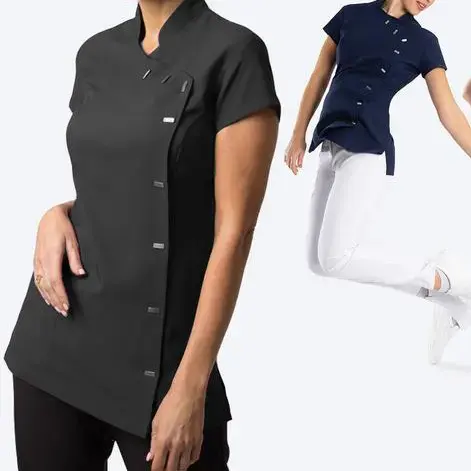 ชุดยูนิฟอร์มสปาแบบคอหงส์ สไตล์โมเดิร์น สำหรับผู้หญิง ใช้ในโรงแรมและร้านเสริมสวย ผลิตจากผ้าสแปนเด็กซ์ผสมเรยอน ยืดหยุ่น ระบายอากาศได้ดี รับผลิตตามสั่งขายส่ง