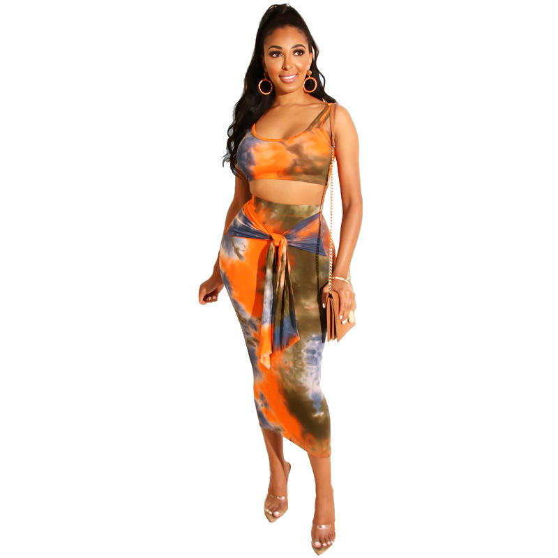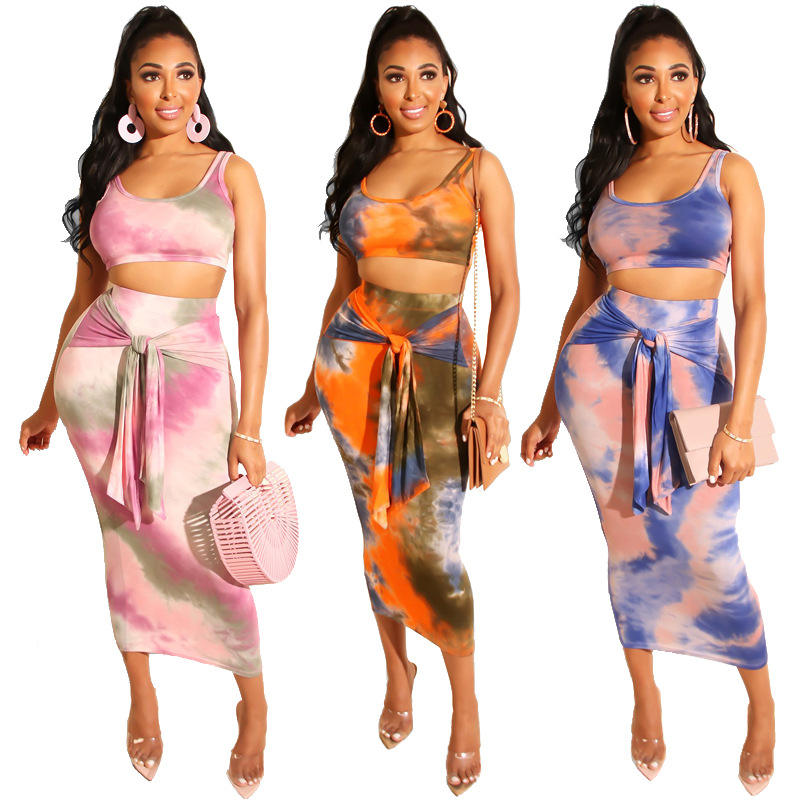 ชุด2ชิ้นเสื้อครอปกระโปรงยาวของผู้หญิงชุด2ชิ้นสุดหรูย้อมสีมัดย้อมสำหรับฤดูร้อนกำหนดเองได้2023