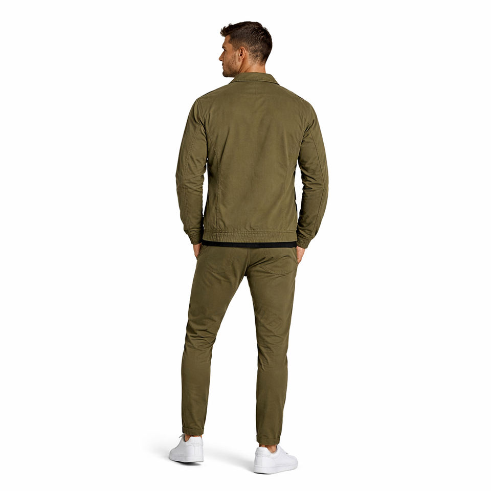 ชุดแจ็คเก็ตและกางเกงขายส่งสำหรับผู้ชาย สีเขียวมะกอก ชุดลำลองทรงเข้ารูป แจ็คเก็ตแบบซิป กางเกงชิโน่ ชุดแฟชั่นสตรีทแวร์แบบสั่งทำ OEM