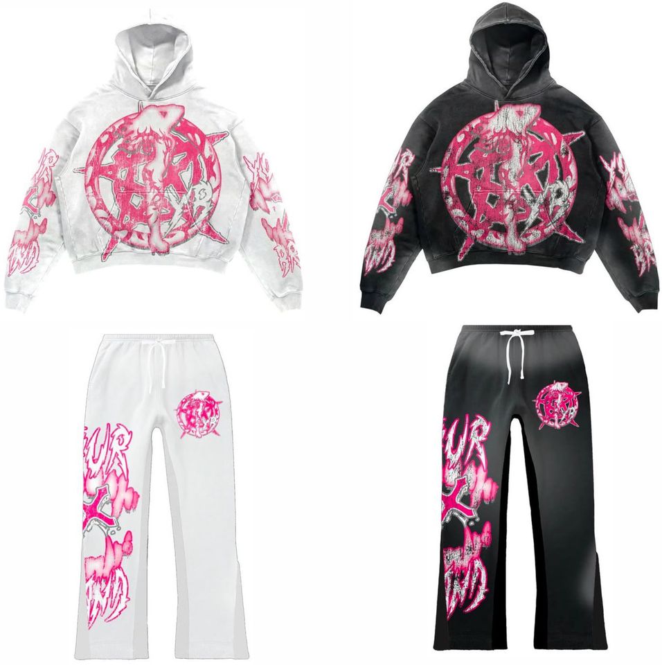 ชุดเซ็ตฮู้ดดี้และกางเกงวอร์มทรงขาบานสำหรับผู้ชาย สไตล์วินเทจ ปักลาย ซักล้างพิเศษ สีซีดจาง ซิปยาวเต็มตัว รับผลิตตามสั่งขายส่ง