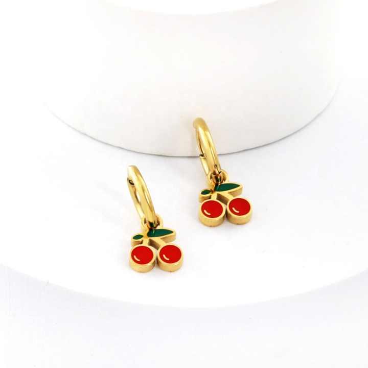 Wholesale Custom Waterproof Plated 14k Gold Hoop Earrings Stainless Steel Fashion Jewelry Drop Fruit Cherry Earrings for Women