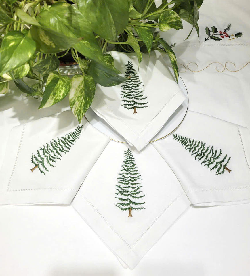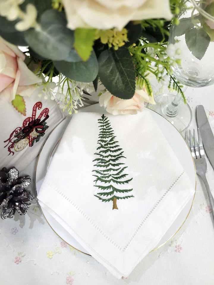 Wholesale Custom White Cotton Embroidered Christmas Tree Napkin Handmade Classic Hemstitch Table Napkins for Home Events