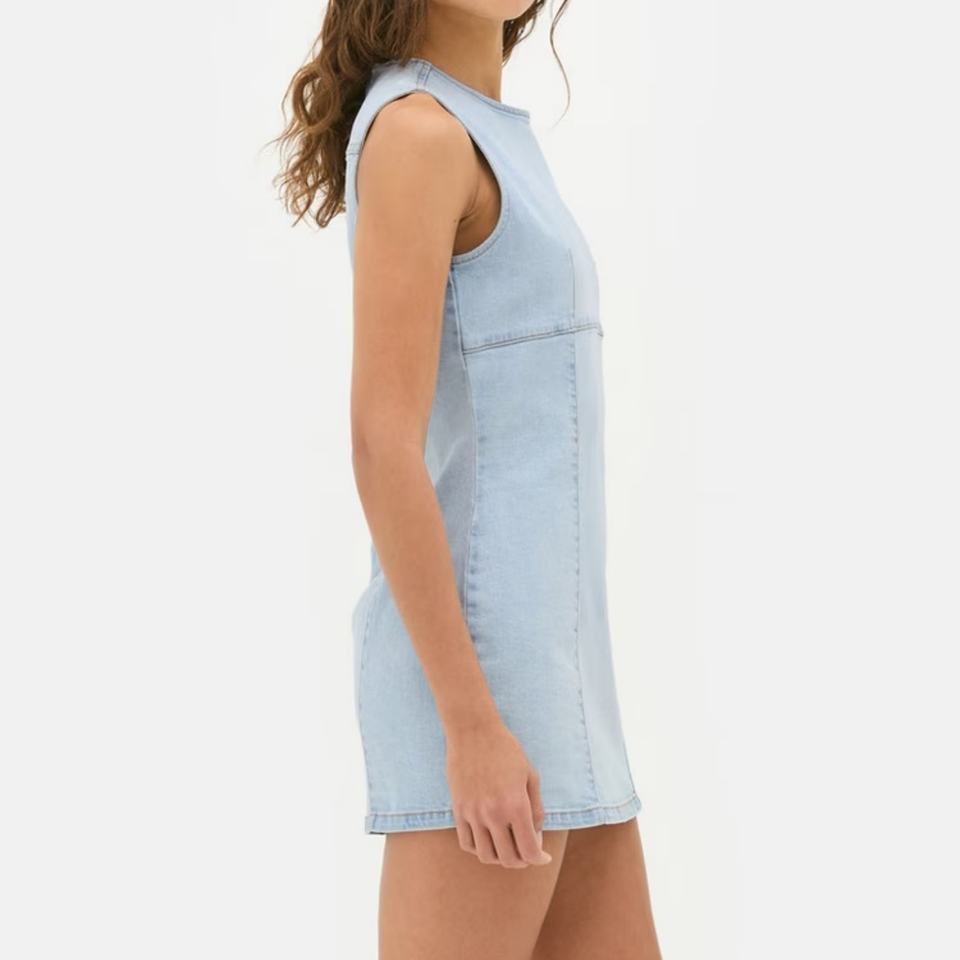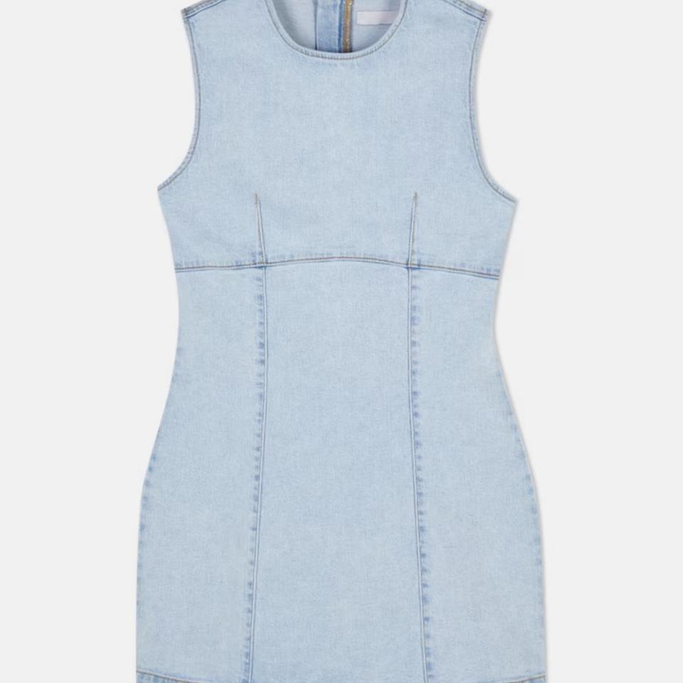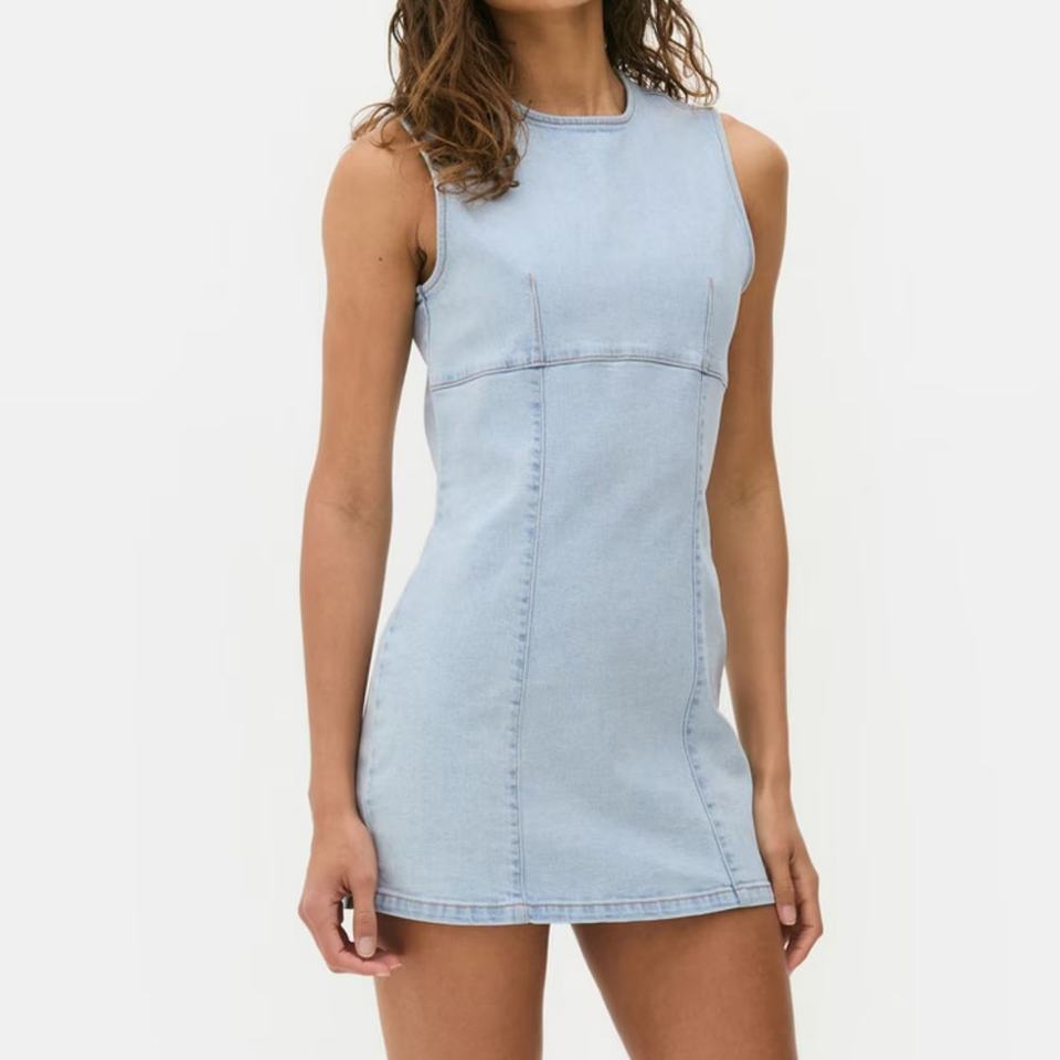 เดรสยีนส์สีน้ำเงินคอกลมทรงเข้ารูปดีไซน์ใหม่สำหรับผู้หญิงขายส่งแบบกำหนดเองได้