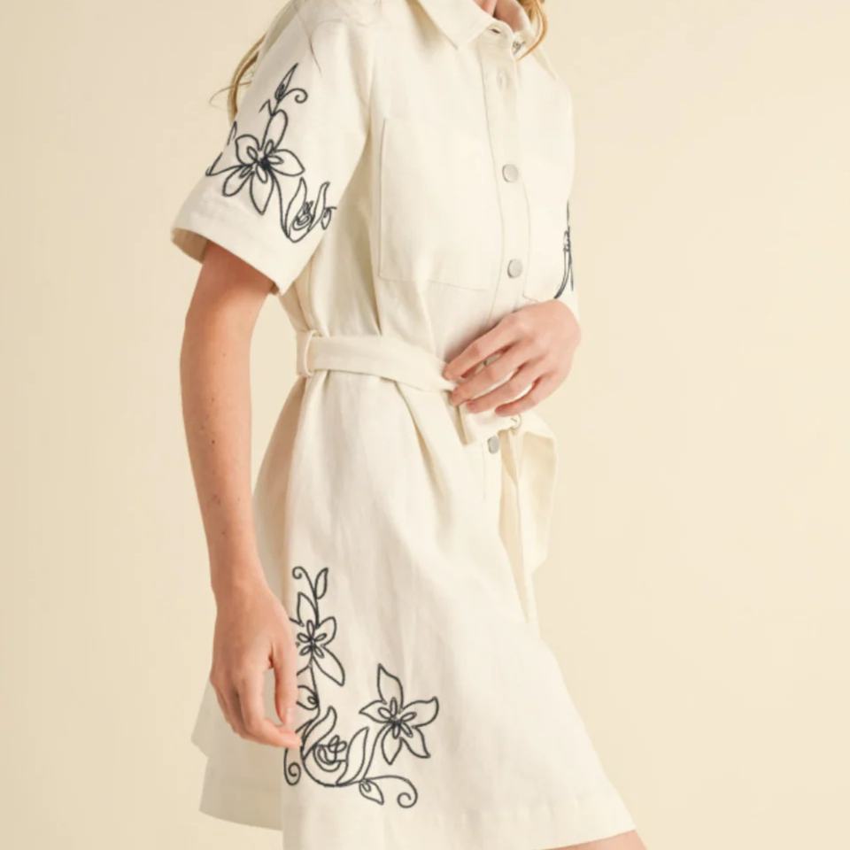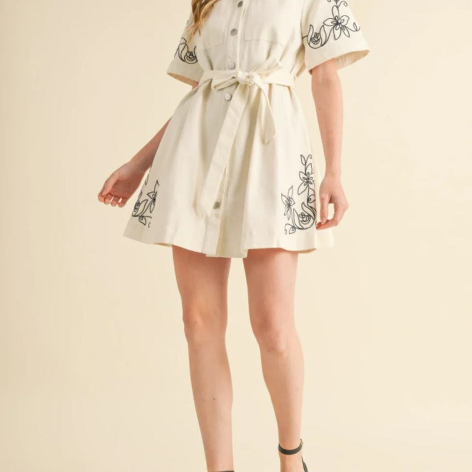 เดรสยีนส์ปักลายดอกไม้ดีไซน์ใหม่สำหรับผู้หญิง ขายส่งแบบกำหนดเองได้ พร้อมเข็มขัดและกระดุม