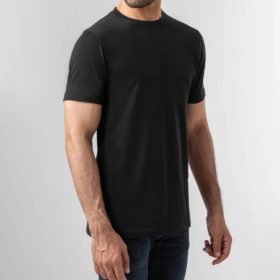 เสื้อยืดผู้ชายสีดำเรียบง่าย สั่งทำโลโก้แบรนด์ของคุณเอง ผ้าฝ้าย 100% ราคาถูก ขายส่ง