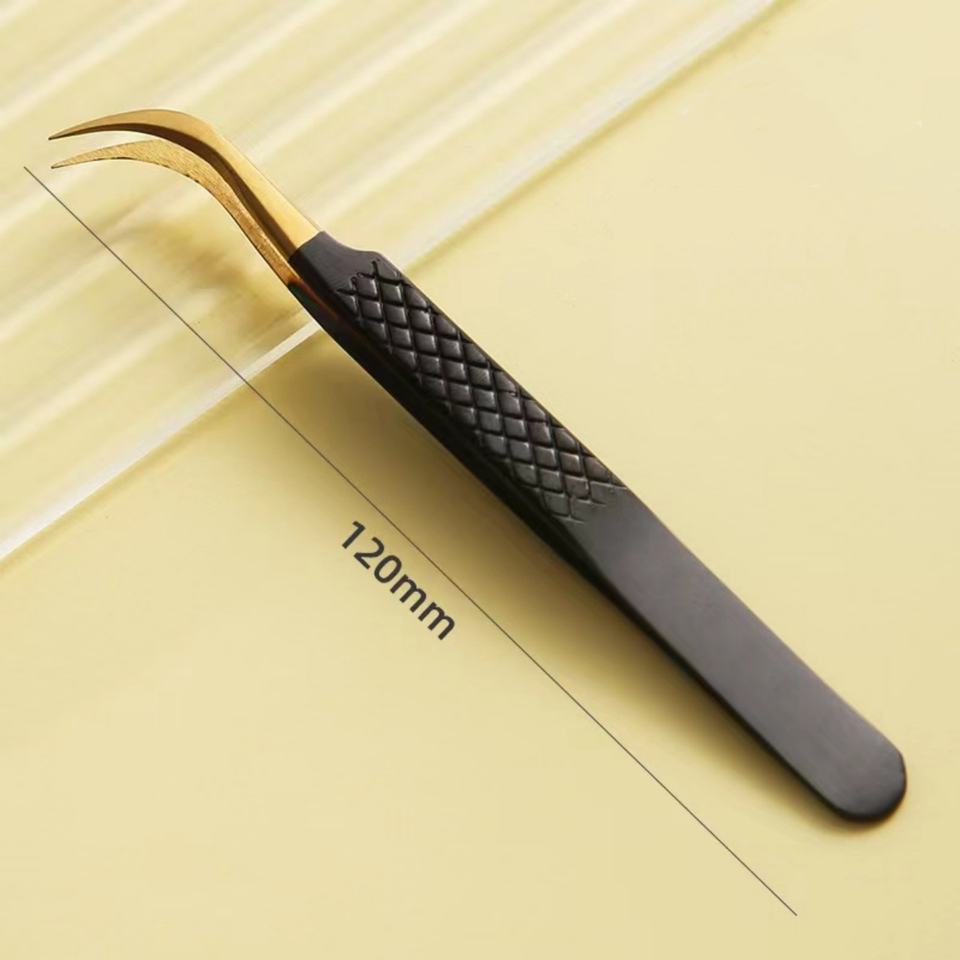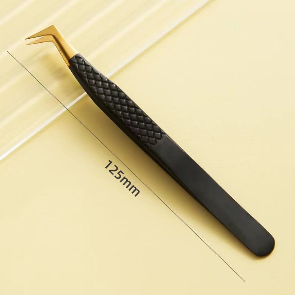 แหนบต่อขนตาปลายแหลมแบบไฟเบอร์ ทำจากสแตนเลสสีดำ ด้ามจับโค้ง พร้อมโลโก้สั่งทำได้ ขายส่ง