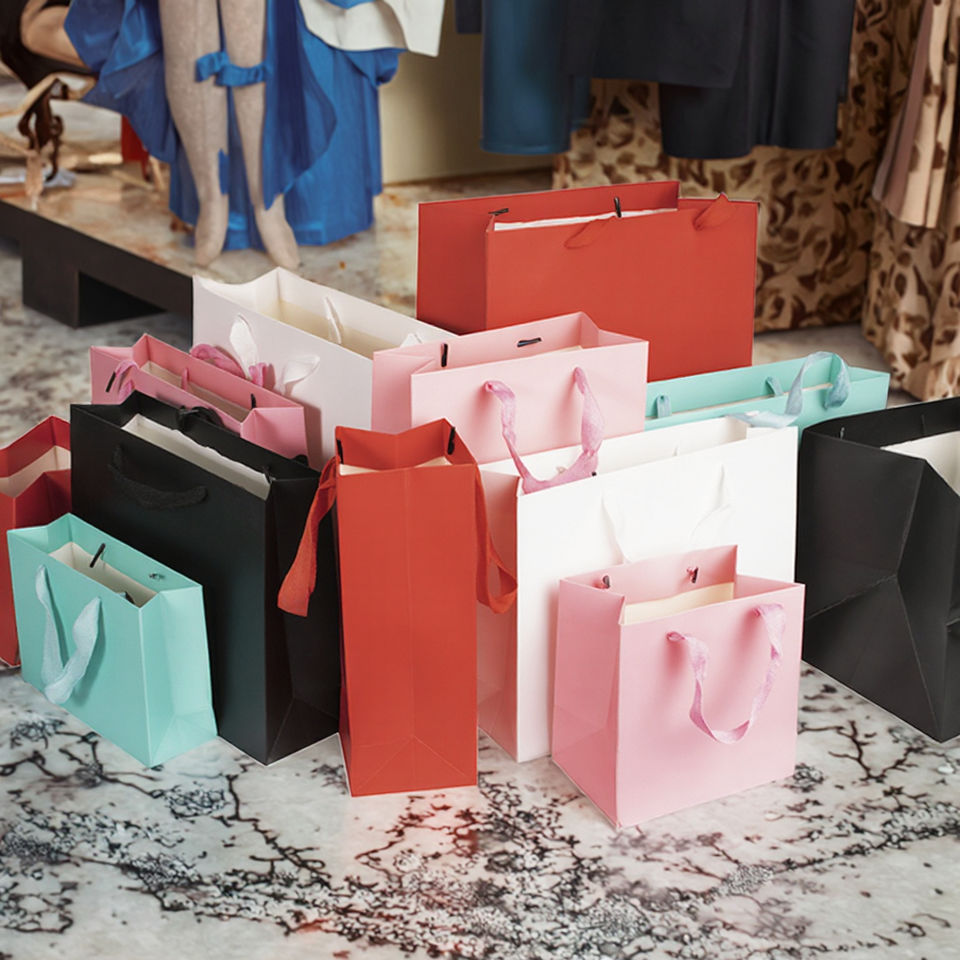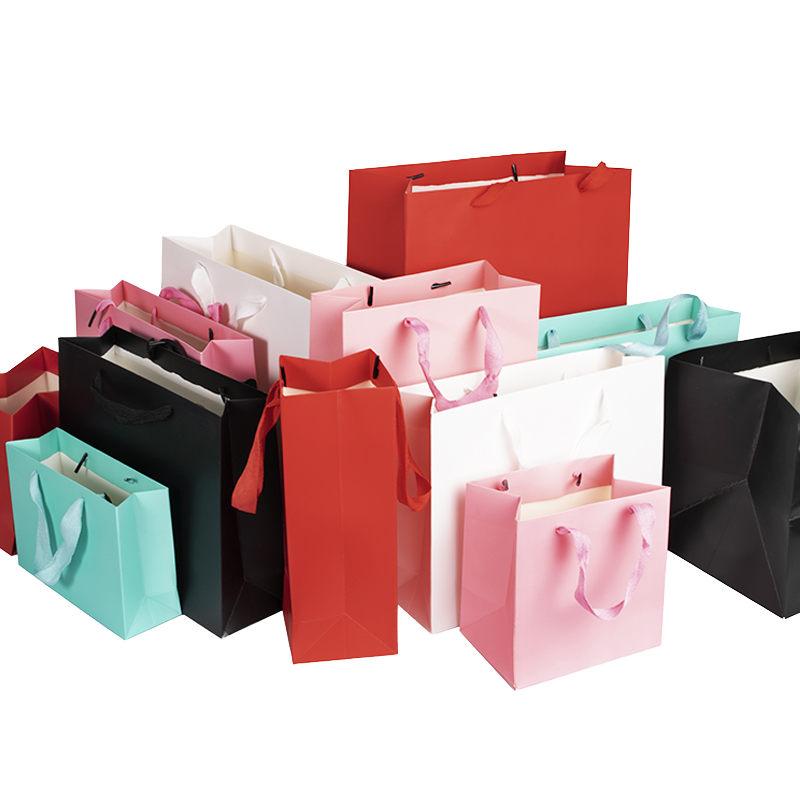 ถุงช้อปปิ้งกระดาษแข็งสีชมพูหรูหราแบบกำหนดเองได้พร้อมริบบิ้น ถุงหิ้วแบบนำกลับมาใช้ใหม่สำหรับแบรนด์และร้านค้า