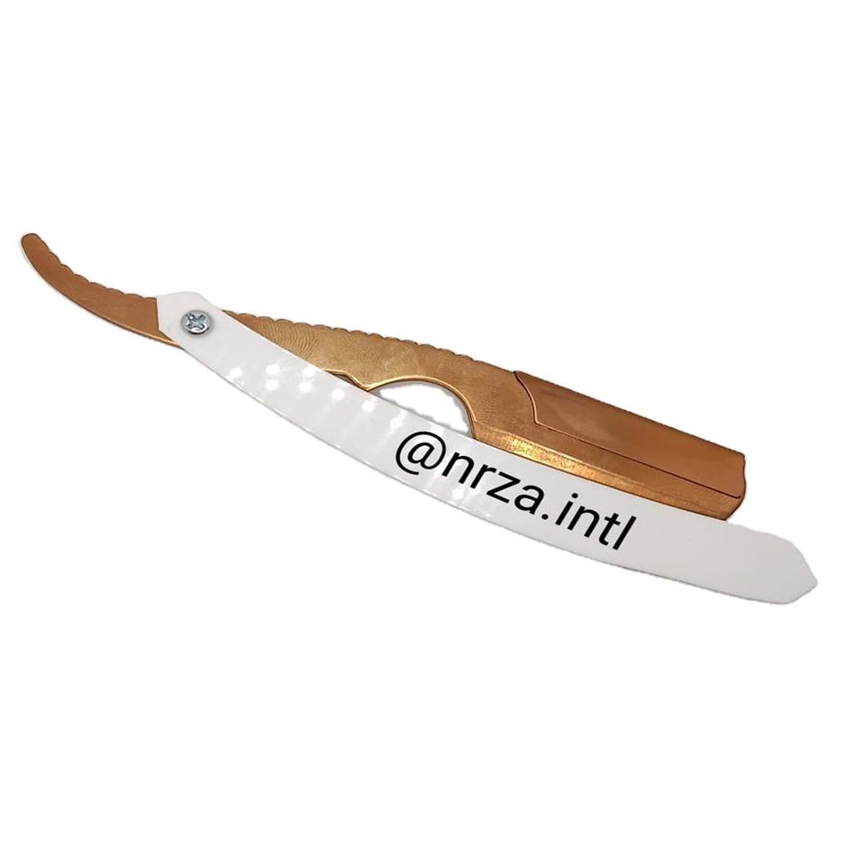 มีดโกนตรงสแตนเลสคุณภาพสูงสำหรับร้านเสริมสวย ใบมีดสีทอง ปลอดภัยสำหรับตัดผมและบิกินี่ รับผลิตตามสั่งและติดฉลากส่วนตัวสำหรับขายส่ง