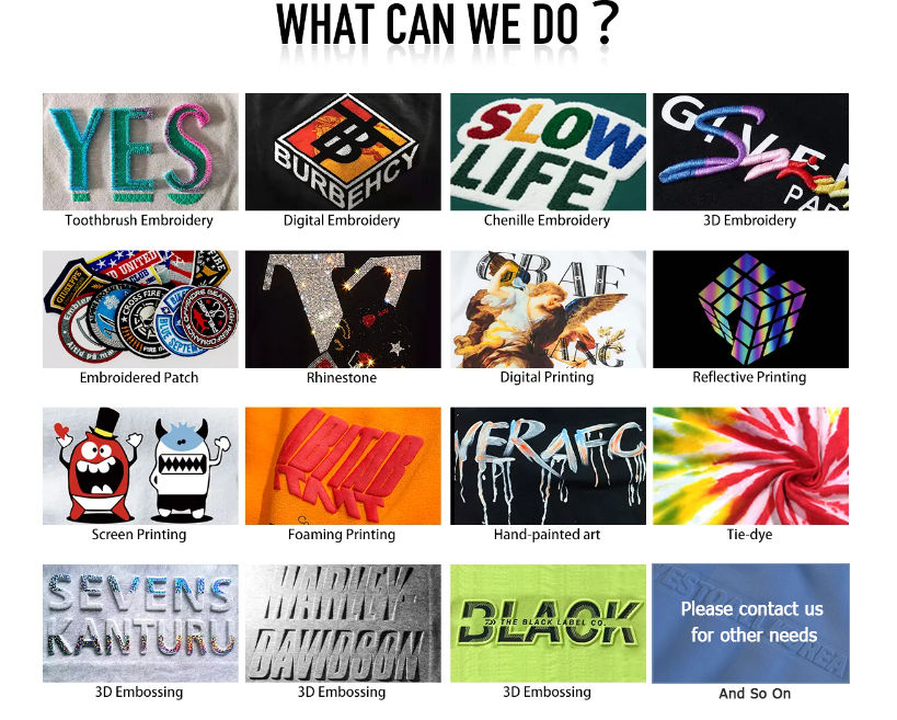 Printing Methods:Discharge Printing, Tie-dye, Puff Printing, Embossed, Heat-Transfer Printing, Digital Printing, Silk Screen Printing, DRIPPING, Raised Rubber Print, Sublimation Transfer Print, Glitter Print, Foil Print, Luminous Print, Flock Print, Pigment Printing, reflective printing