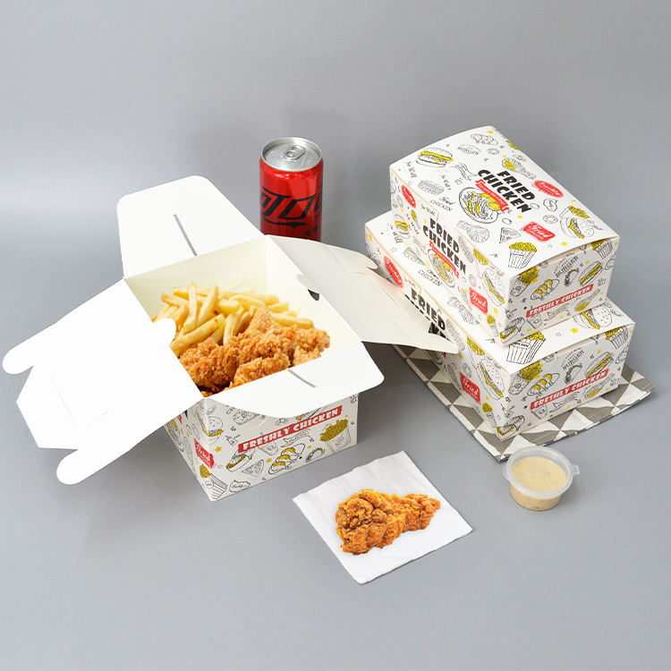 กล่องกระดาษบรรจุภัณฑ์อาหารจานด่วนแบบกำหนดเองสำหรับขายส่ง อาหารนำกลับบ้าน ไก่ทอดแบบฝรั่งเศส ไก่เน็ตติ้ง ปีกไก่ อาหารกลางวันแบบซื้อกลับบ้าน