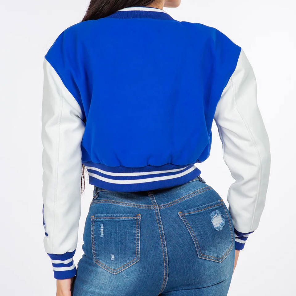 แจ็กเก็ตเบสบอลบอมเบอร์ขนแกะสำหรับผู้หญิงตัวสั้นระบายอากาศปักตัวอักษร