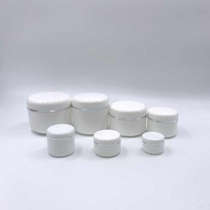 ขวดครีมเปล่าพลาสติกทรงกลมสีขาวขอบเงิน บรรจุภัณฑ์ผลิตภัณฑ์บำรุงผิว รับผลิตตามสั่งพร้อมโลโก้ ปริมาณ 30 มล. 50 มล. 100 มล.