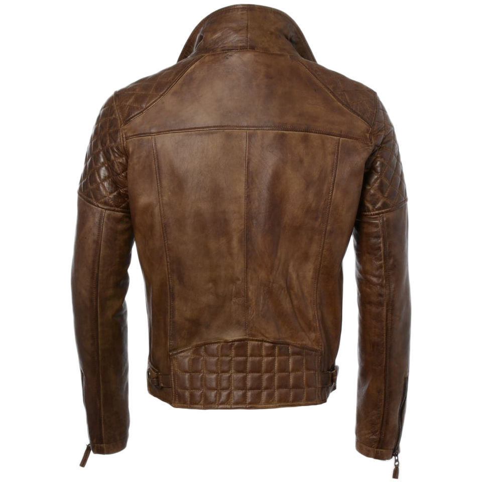 แจ็คเก็ตนักขี่จักรยานหนังนิ่มสีน้ำตาลสำหรับผู้ชายเสื้อหนังแกะแท้พร้อมคอตั้ง