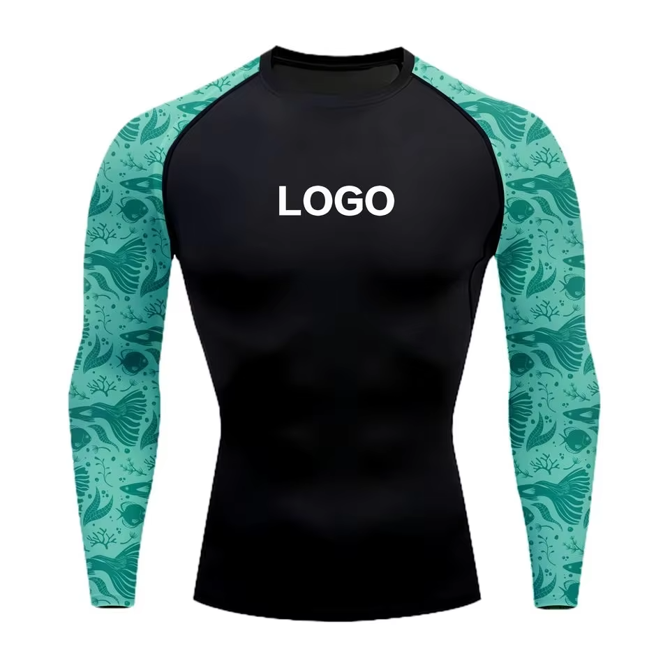 เสื้อแรชการ์ดกันแดดแบบสั้น แห้งเร็ว เป็นมิตรกับสิ่งแวดล้อม สำหรับเล่นน้ำและเล่นเซิร์ฟ รับผลิตตามสั่งแบบ OEM ขายส่ง