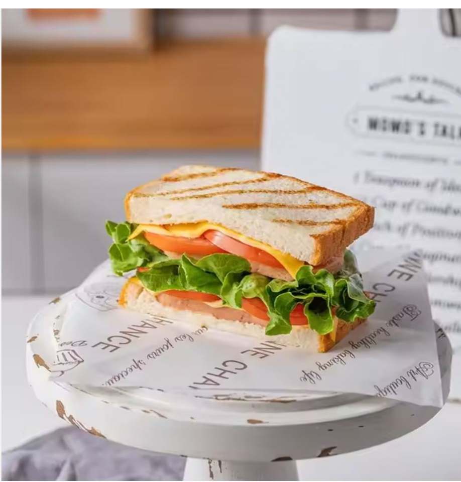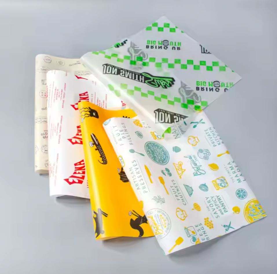 กระดาษห่ออาหารเคลือบ PE กันไขมัน พิมพ์โลโก้ตามสั่ง สำหรับเบอร์เกอร์ ไก่ทอด เฟรนช์ฟรายส์ ขายส่ง