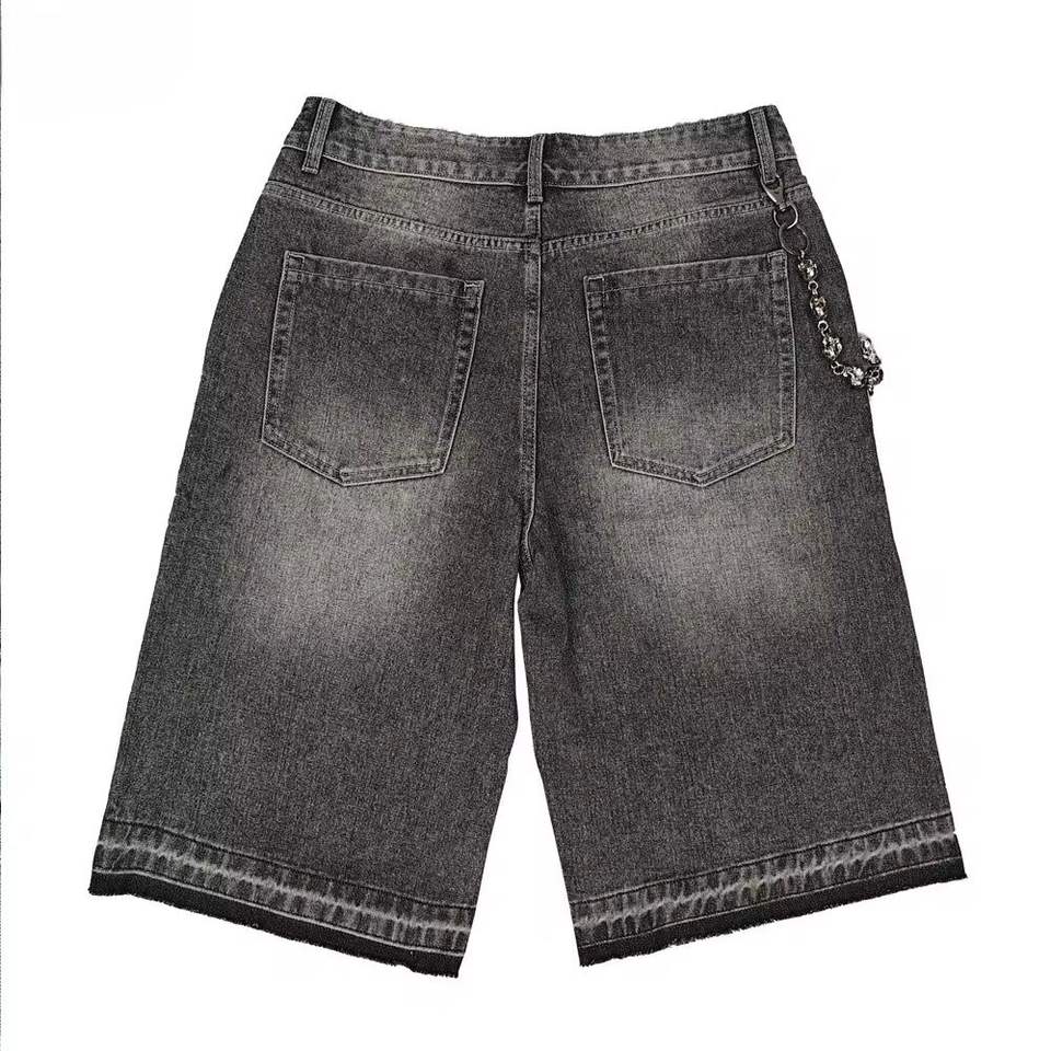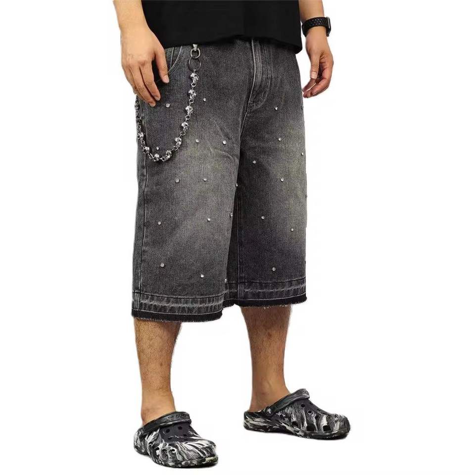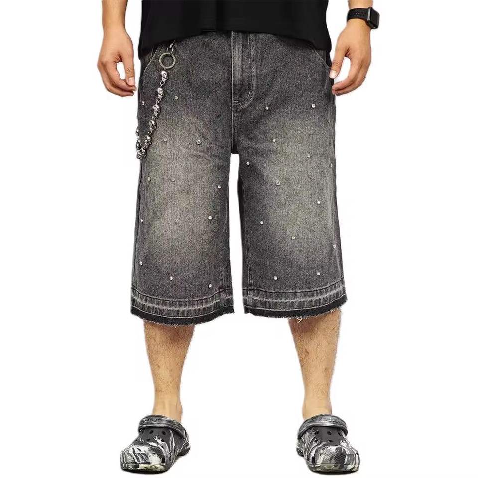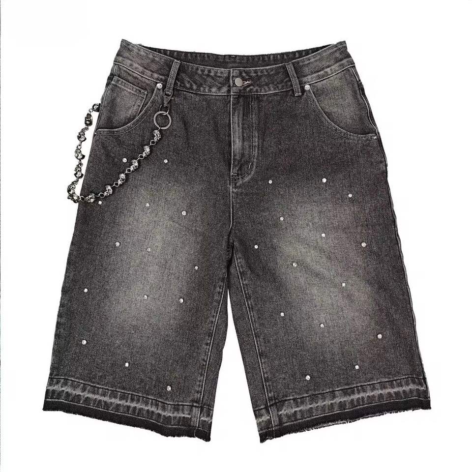 กางเกงยีนส์ขาสั้นทรงตรงแบบขายส่งสั่งทำได้ สไตล์วินเทจ เอวกลาง แต่งขาด ฟอกสีแบบแอซิดวอช ประดับลูกไม้และเพชร กางเกงยีนส์ขาสั้นสำหรับผู้ชายใส่หน้าร้อน