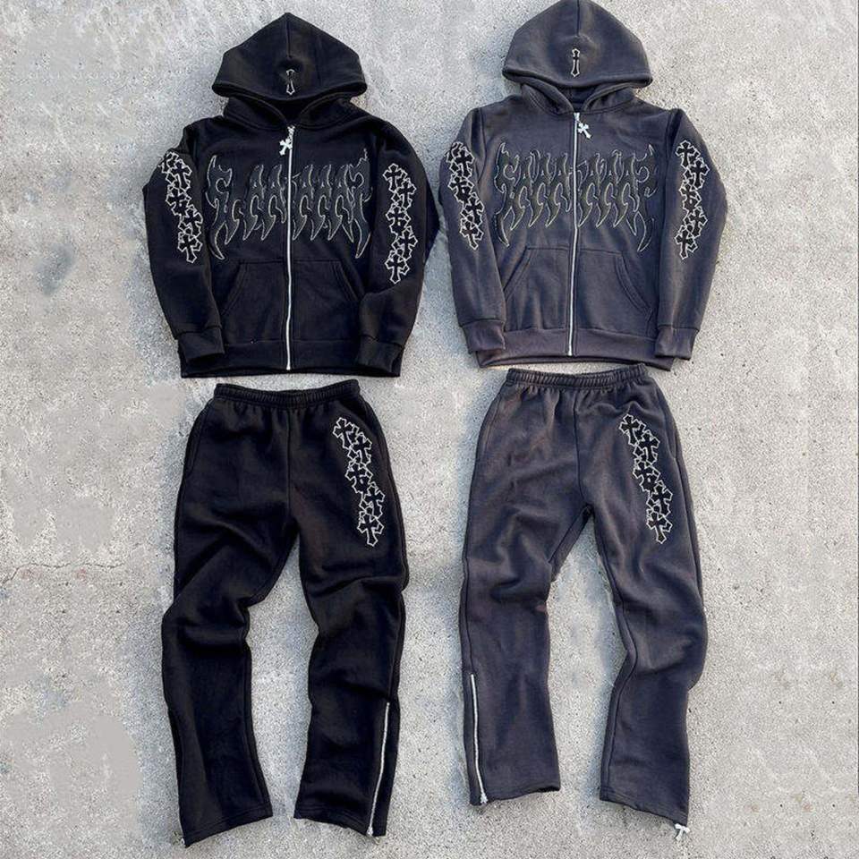 ชุดเซ็ตเสื้อฮู้ดดี้และกางเกงวอร์มสตรีทแวร์แบบขายส่ง สั่งทำได้ ลวดลายย้อมสีแบบ Acid Wash แต่งคริสตัล พร้อมซิป