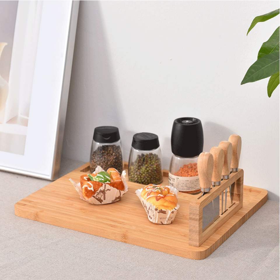 ถาดไม้ไผ่เสิร์ฟชีส DD1027 พร้อมมีดสแตนเลส 4 ชิ้น ชุดชาร์กูเตอรีขนาดใหญ่ ขายส่ง