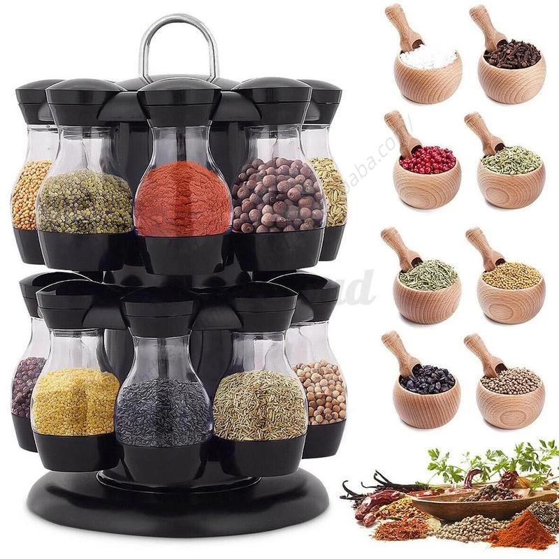 ชั้นวางเครื่องเทศสมุนไพร DD997 พร้อมขวดแก้ว 12 ใบ สำหรับจัดเก็บในครัวแบบหมุนได้ ขายส่ง