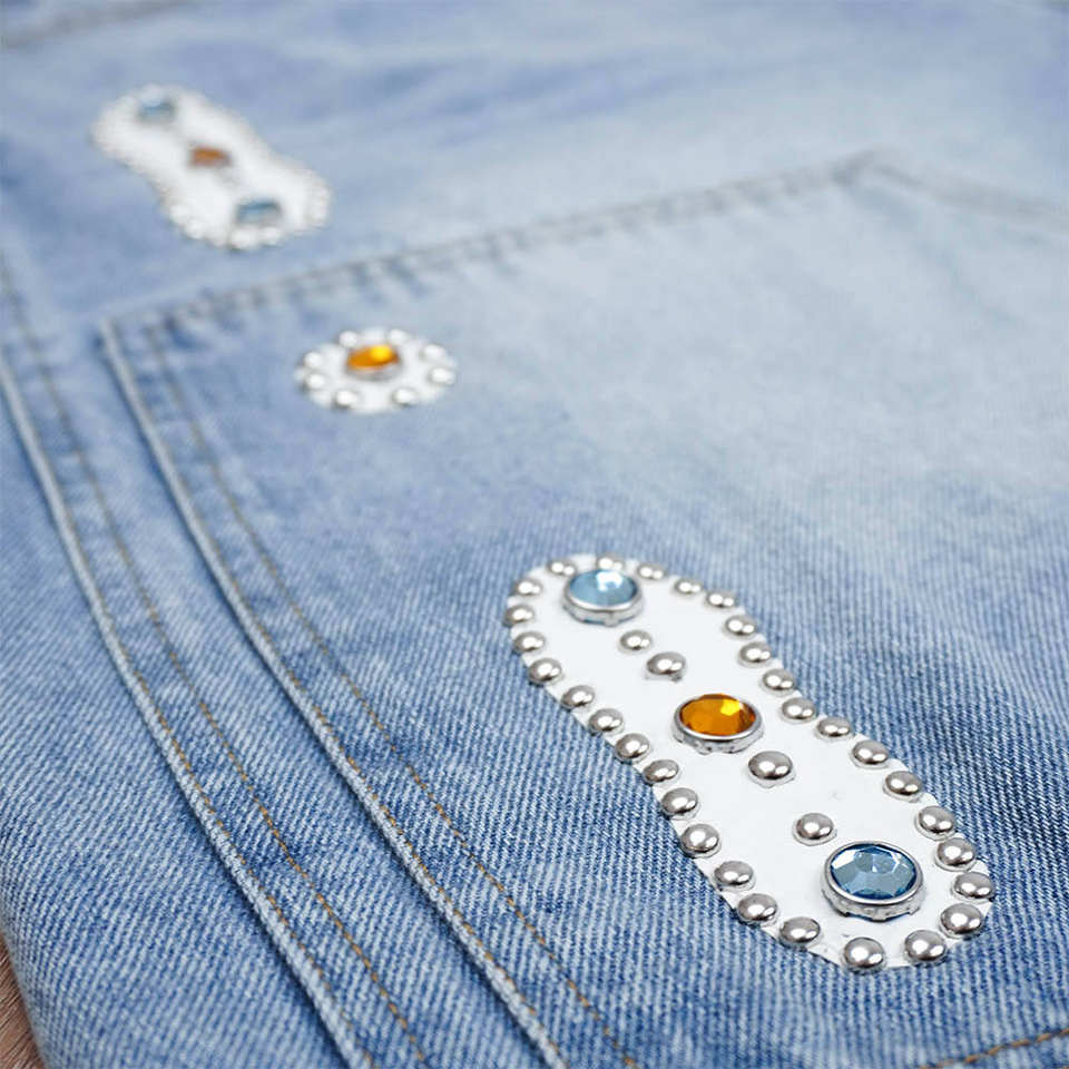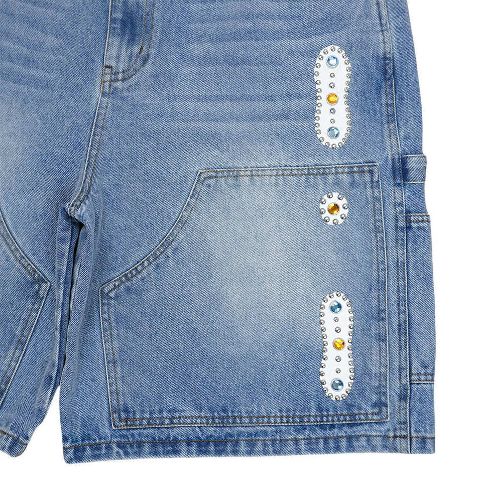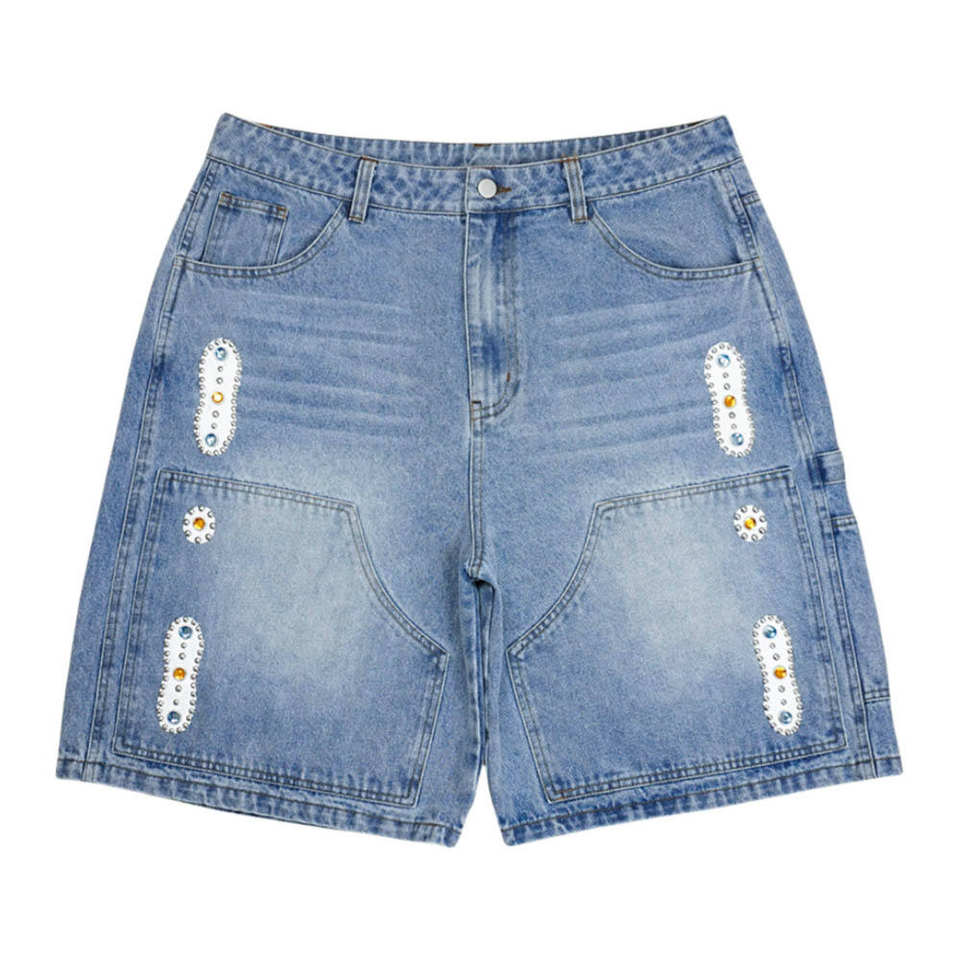 กางเกงยีนส์เดนิมขายส่งแบบสั่งทำพิเศษ ล้างแบบดิสเทรส ขอบดิบ เย็บเข่าสองชั้น กางเกงยีนส์ขาสั้นประดับอัญมณี จิวเวลรี่ สตั๊ด รีเวท ไรน์สโตน