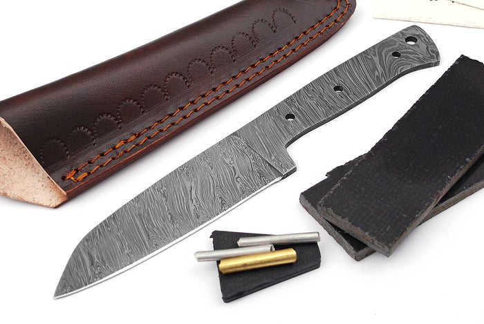 ชุดทำมีดเหล็กดามัสกัสแบบเต็มใบ พร้อมปลอกหนังและอุปกรณ์ทองเหลือง สำหรับขายส่ง รับผลิตแบบ OEM/ODM