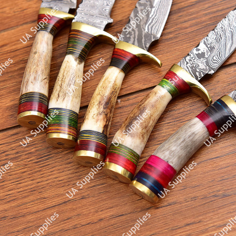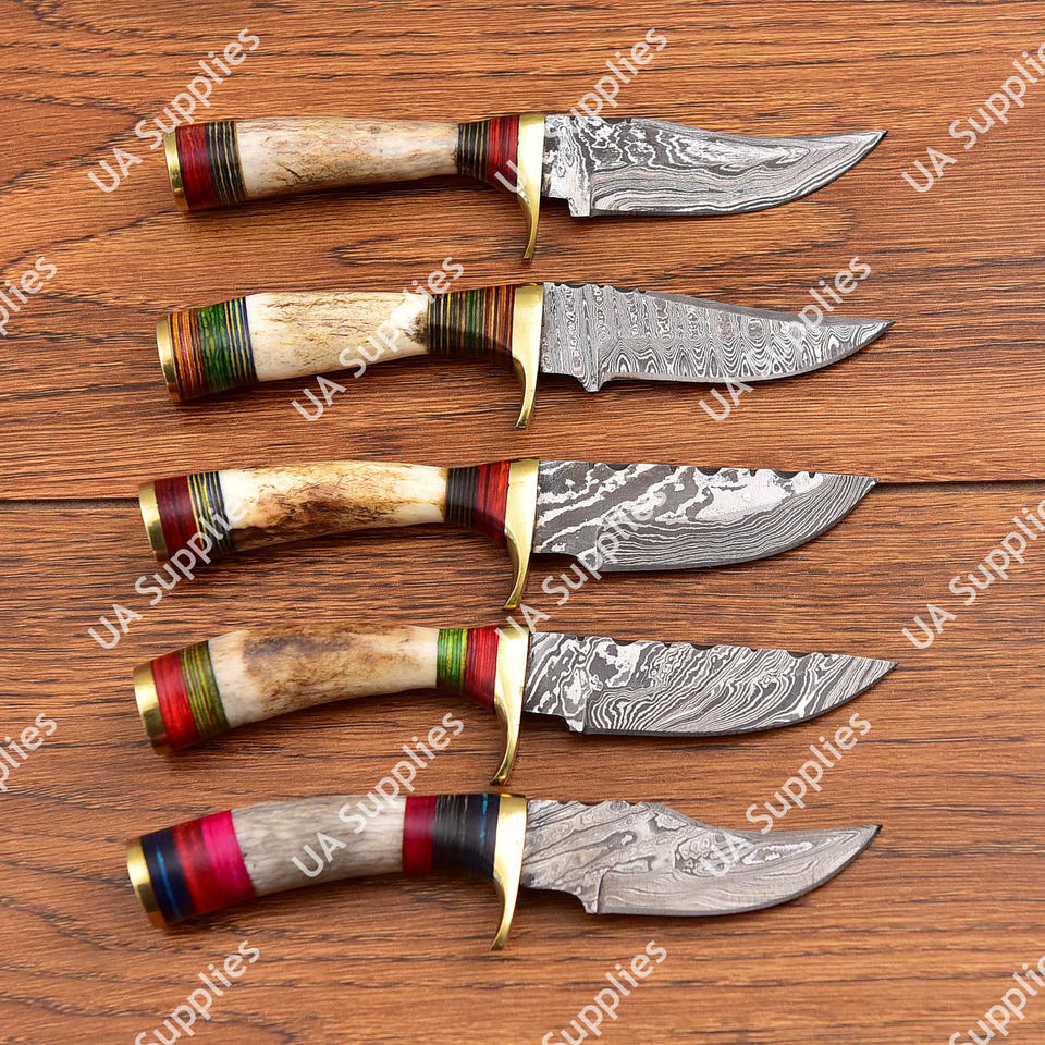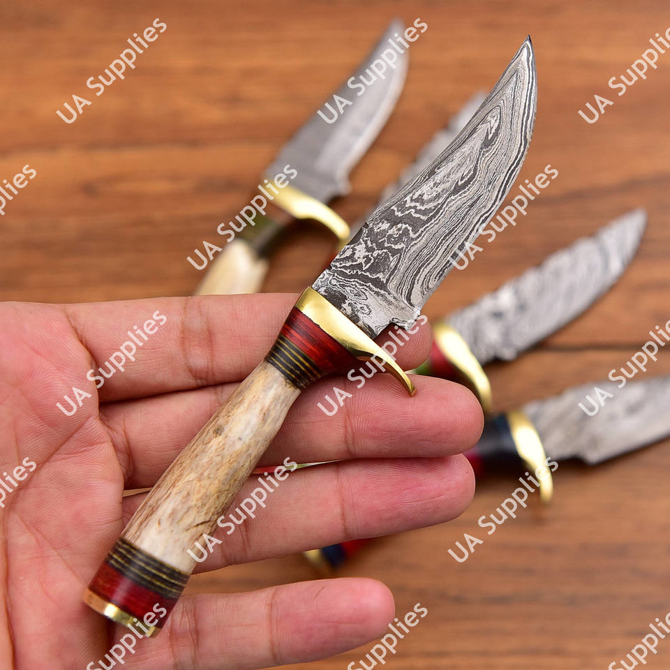 มีดเหล็กดามัสกัสคมกริบสำหรับขายส่ง ทำเองได้ ใช้ในชีวิตประจำวัน ตั้งแคมป์ ล่าสัตว์ มีดขนาดเล็ก ด้ามทำจากเขาสัตว์ พร้อมปลอกหนัง รับผลิตแบบ OEM/ODM/OBM