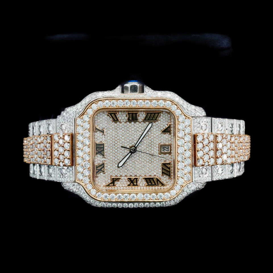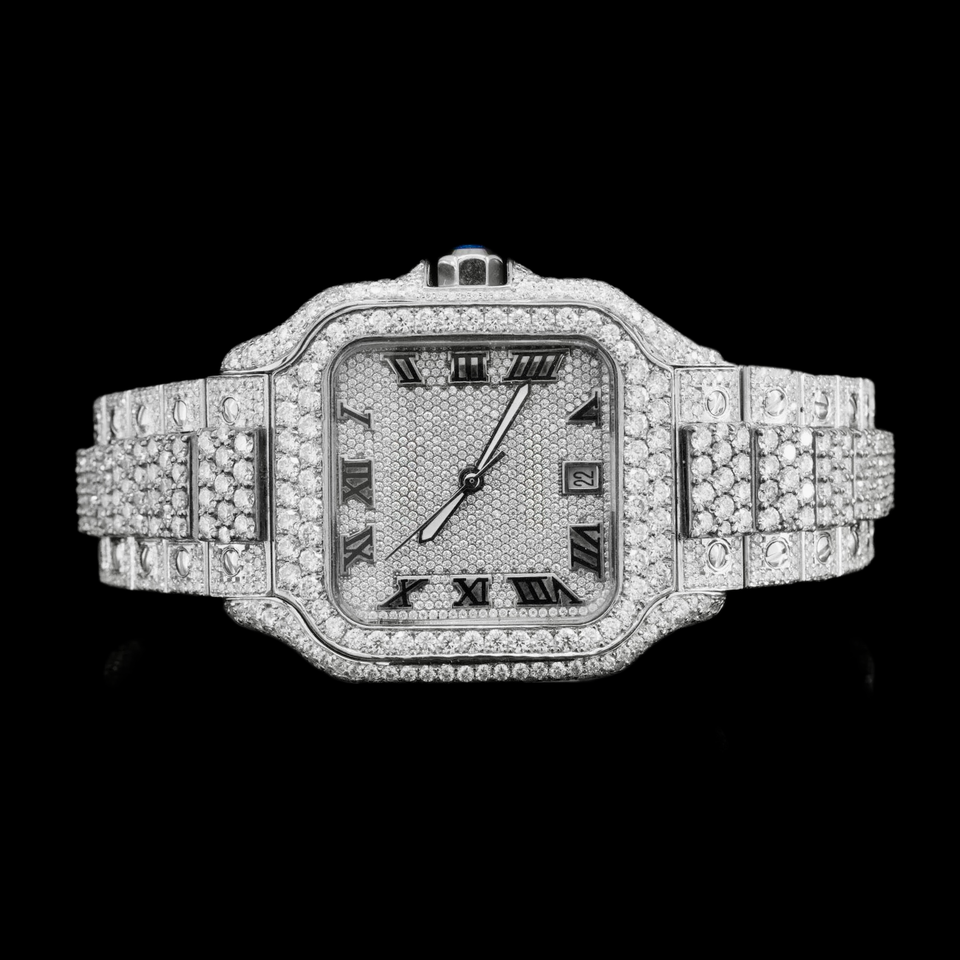 นาฬิกาข้อมือผู้ชายทรงสี่เหลี่ยมประดับเพชรโมอิสซาไนต์ทรงกลม ดีไซน์หรูหรา ตัวเรือนฝังเพชรแบบ Iced Out หน้าปัดเลขโรมัน พร้อมขอบตัวเรือนแบบ Iced Out สไตล์ฮิปฮอป ขายส่ง