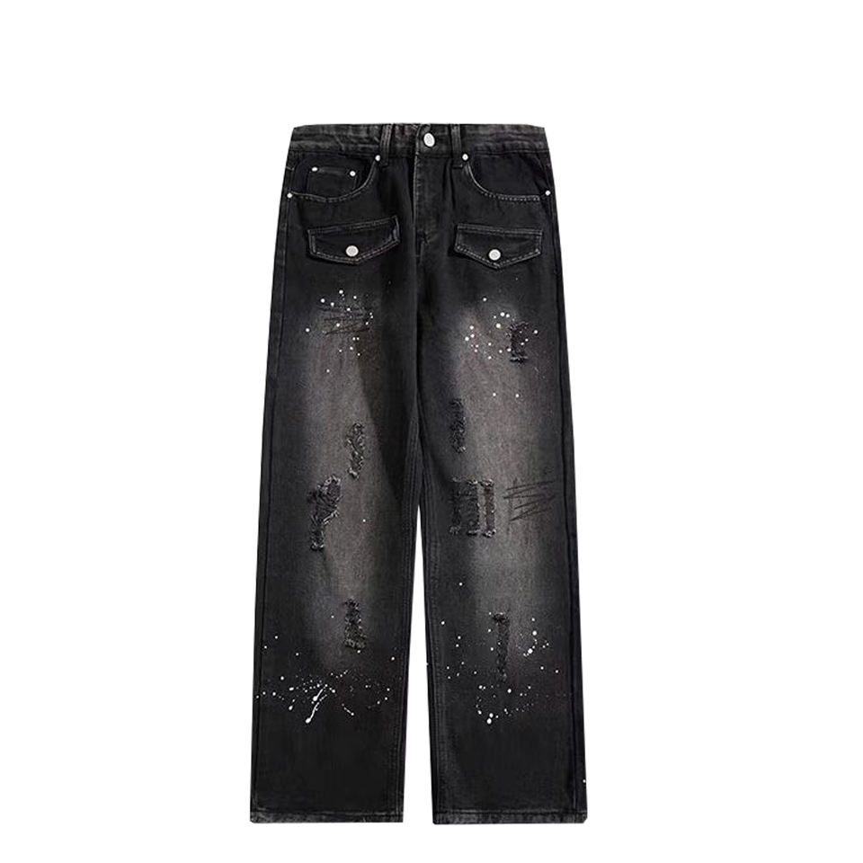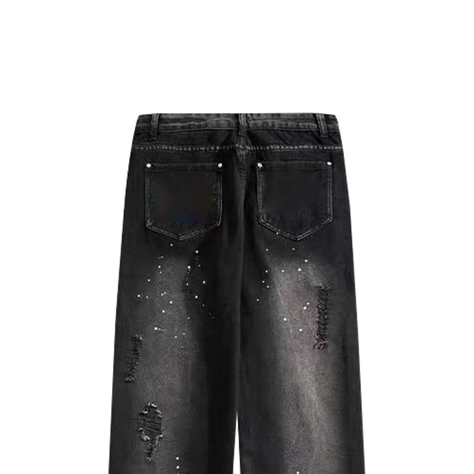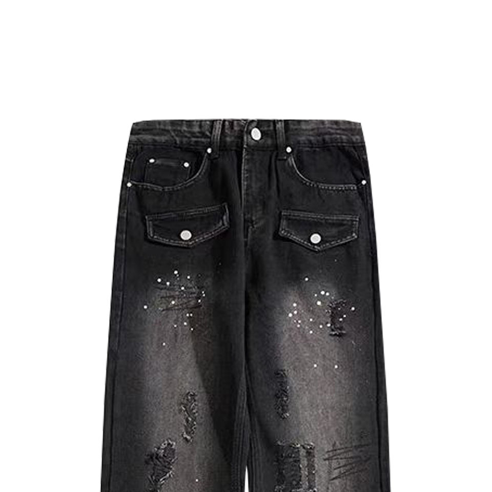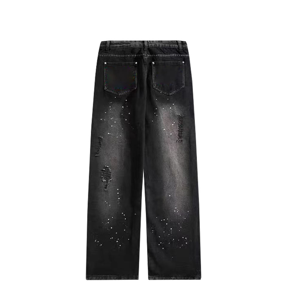 กางเกงยีนส์ดีไซน์เนอร์ขายส่ง ทรงแบ็กกี้ แต่งลายคลื่น ประดับเพชร วินเทจ สำหรับผู้ชาย สีซีด กางเกงขากว้าง ผ้าถักทอ